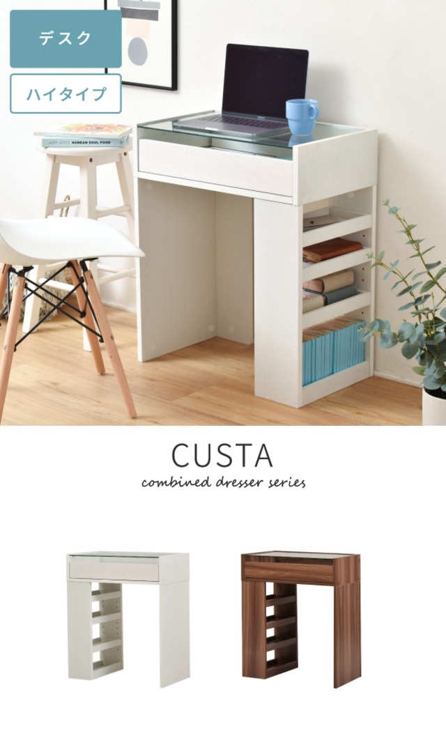 強化ガラスを使用した、ガラストップのハイデスク。美しいだけでなく強化ガラスで安全性もばっちり。サイドには高さを調節できる棚もあるので、収納力もばっちり。 美しいガラストップが特徴的なハイデスク。引き出しの中に入れたものが見えるので、お気に入りの筆記用具を収納すれば見た目も一層おしゃれになります。サイドには可動式の棚も付いているので本や雑貨などもたっぷり収納できます。 ※送料込みですが、沖縄・離島 等一部地域は事前に相談ください。 ※商品名以外は参考・イメージ写真です。 [外寸]幅60×奥行35×高さ71cm [内寸] (デスク天板)幅56×奥行32.5 (引き出し)幅53.5×奥行28×高さ4(最大9.5)cm (オープン部)幅11.5×奥行31×高さ54cm (可動トレイ)幅12.5×奥行28×高さ3.5cm(3.2cmピッチ11穴) (デスク下)幅43×奥行33×高さ55.5cm [本体]プリント紙化粧合板 [前板]合成樹脂化粧繊維板(PVC) [天板]強化ガラス(5mm厚) [天板]約5kg以下 [引き出し]約5kg以下 [可動ラック]各約5kg以下 ・可動トレイ:3枚 ・背面化粧あり 生産国:中国 お客様組立(30分)(目安,大人2人)