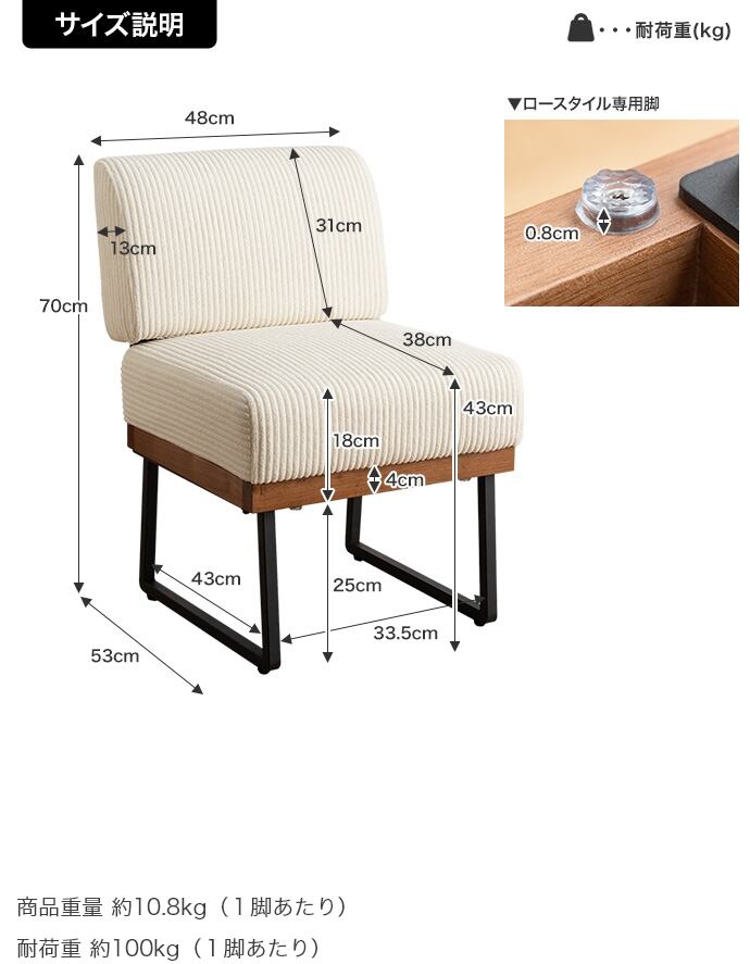 〇サイズ:幅48cm×奥行53cm×高さ70cm(座面高:43cm) 【ロー脚使用時】高さ46.3cm(座面高:18.8cm)