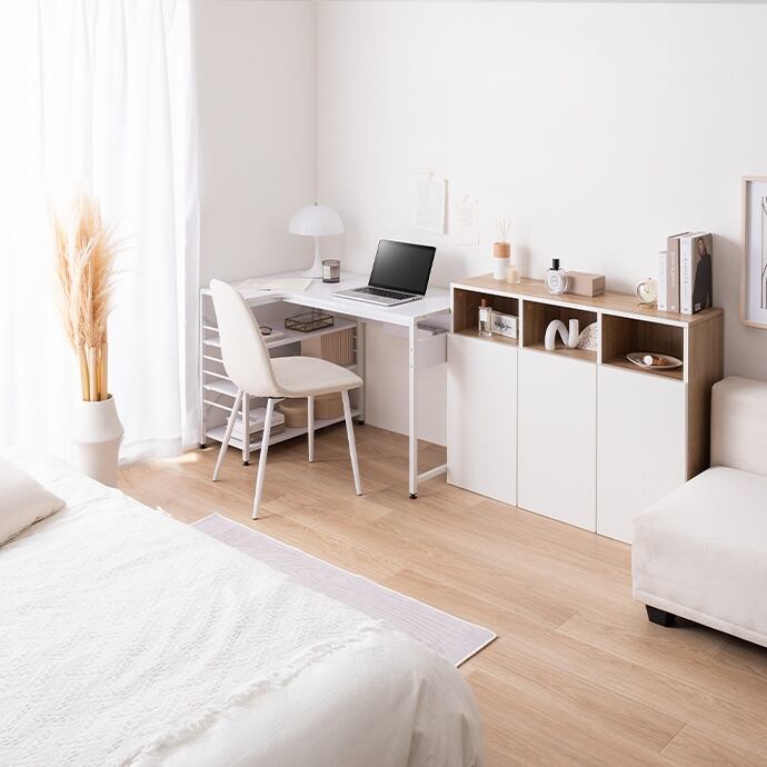 作業スペースと収納を1台で叶える『Elga(エルガ)』L字デスク。コンパクトながらもL字構造の天板により、ゆとりをもって作業いただけます。天板内側は曲線上にすることで、腕や体を動かしやすい設計に。また可動棚付きのサイドラックやコードタップ収納、S字フックが付属しており、日々のデスクワークを快適にするこだわりの詰まったデスクです。