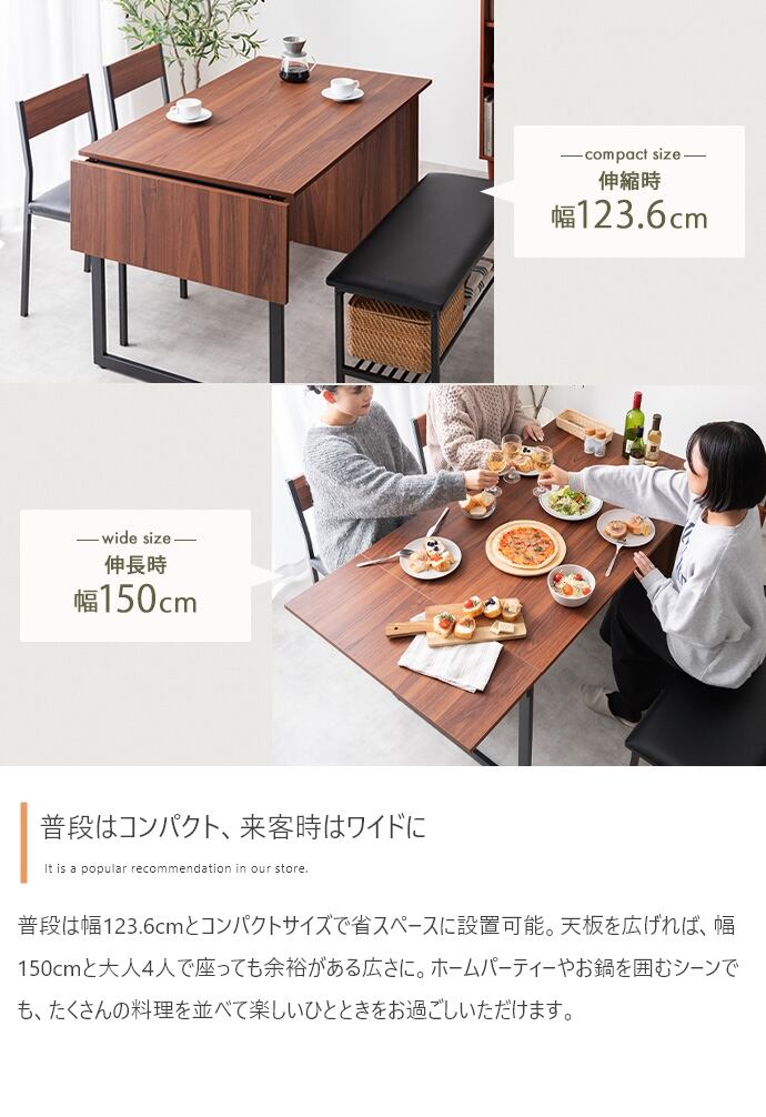 〇サイズ:【テーブル】幅123.6〜150cm×奥行75cm×高さ74cm 【チェア】幅40cm×奥行45.5cm×高さ80cm(座面高:46cm) 【ベンチ】幅90cm×奥行35cm×高さ46cm