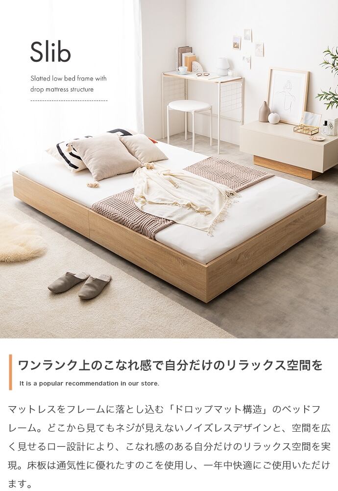マットレスをフレーム内にすっきり収める「ドロップマット構造」の『Slib(スリーブ)』すのこローベッド。どこから見ても美しいノイズレスデザインのフレームは開放感を演出するロー設計で、空間を広々と見せながら、すのこの床板で通気性も確保。一年中快適に使える、自分だけのリラックス空間を実現します。