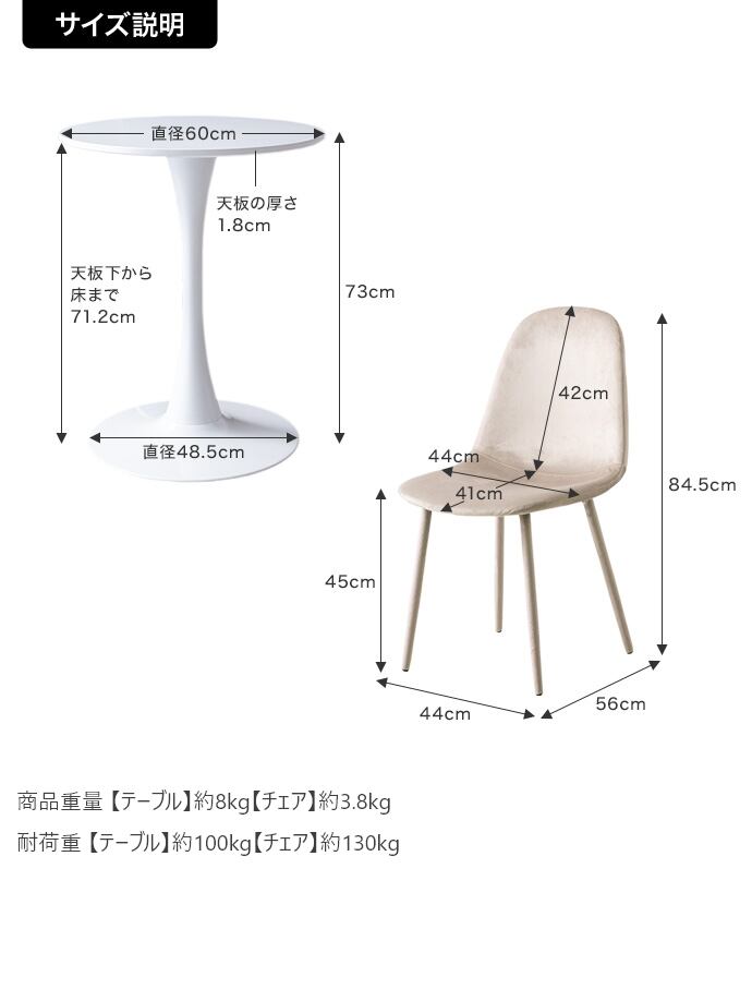 〇サイズ:【テーブル】幅60cm×奥行60cm×高さ73cm 【チェア】幅44cm×奥行56cm×高さ84.5cm(座面高:45cm)