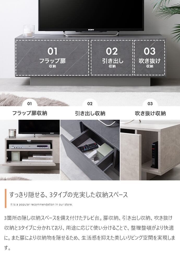 ストーン柄のニュアンスが上質な空間を作る『Sincere(シンシア)』引き出し付きテレビ台。無駄を省いたノイズレスなフォルムと、ストーン柄の組み合わせが美しいデザイン。お部屋に置くだけでアクセントとなり、洗練された空間へと導きます。また3種類の収納スペースにより、デジタル機器や小物を収納可能。視線の集まるテレビ周りをすっきり整えられるテレビ台です。