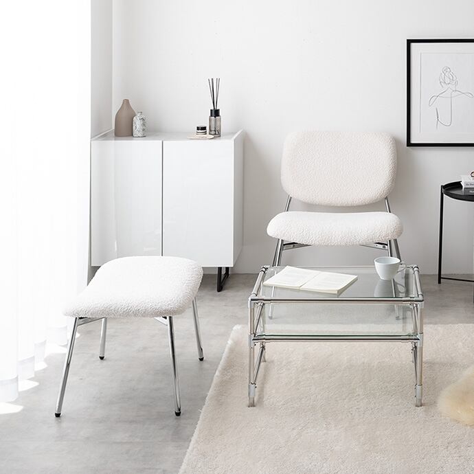 上質な空間でリラックスできる、デザイン性の高いラウンジチェア。モコモコ生地×シルバー脚のデザインは、空間のアクセントになります。また座面は、傾斜のあるフォルムで沈み込みの少ない幅広・奥広設計。デザイン性だけでなく、座り心地も抜群で心地いい時間をお過ごしいただけます。