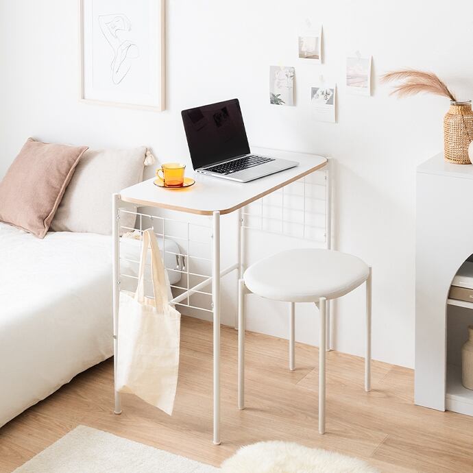 ころんとしたフォルムと、バイカラーのデザインが可愛らしい『Iso(イソ)』デスクセット。デスクの両サイドにはバッグなどを掛けられるメッシュボードを備え、デスク周りもすっきり整理整頓が可能。限られたスペースでも使いやすいコンパクト設計のため、ワンルームや一人暮らしのお部屋にもおすすめです。また作業時間はデスクとして、支度時間はドレッサーとしても使用ができ、シーンに合わせてお使いいただけます。