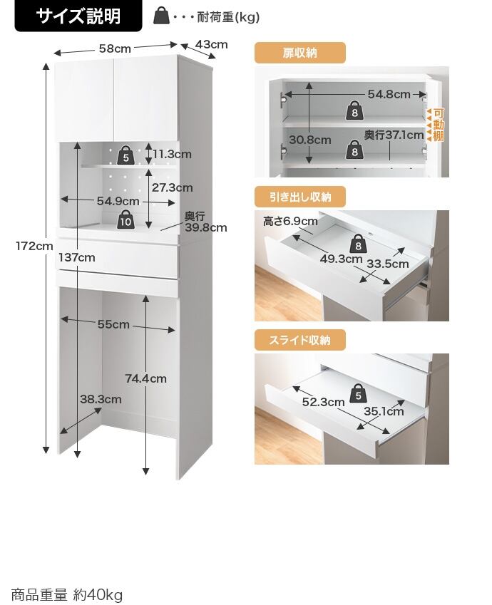 〇重量:【商品重量】約40kg 【耐荷重】扉収納可動棚:約8kg、扉収納底板:約8kg、スパイスラック:約5kg、上段スライドトレー:約10kg、引き出し収納:約8kg、下段スライドトレー:約5kg