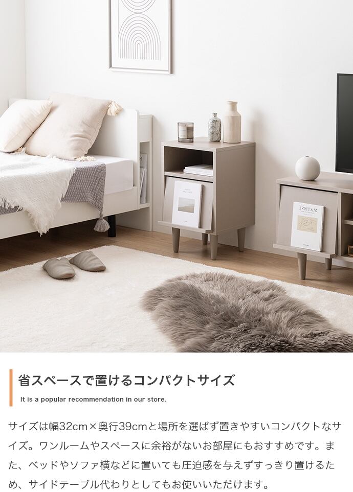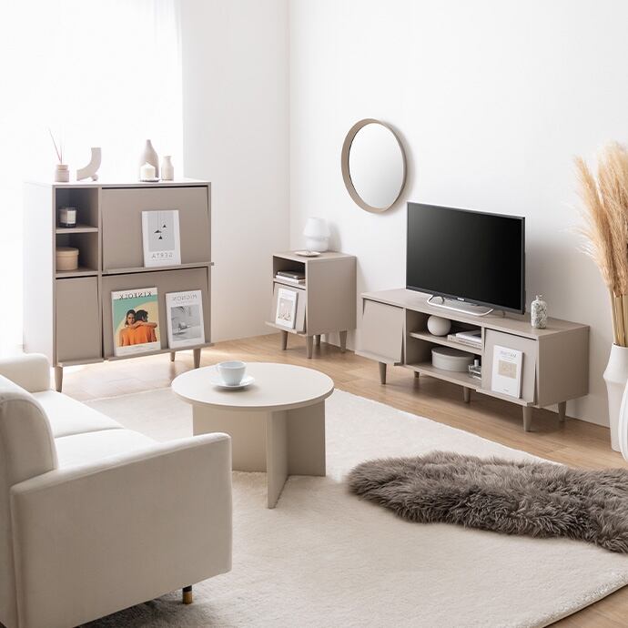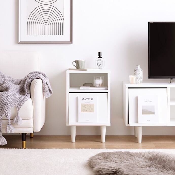 生活感を隠して、ディスプレイで魅せる『Carina(カリーナ)』シリーズのフラップ扉付サイドキャビネット。フラップ扉で生活感のあるものをすっきりと隠し、扉の引き手部分にはお気に入りの雑誌や本をディスプレイできます。統一感のあるワントーンデザインが空間に自然に溶け込み、洗練された印象に。装飾のないノイズレスなデザインが、トレンド感溢れるホテルライクなインテリアを実現します。