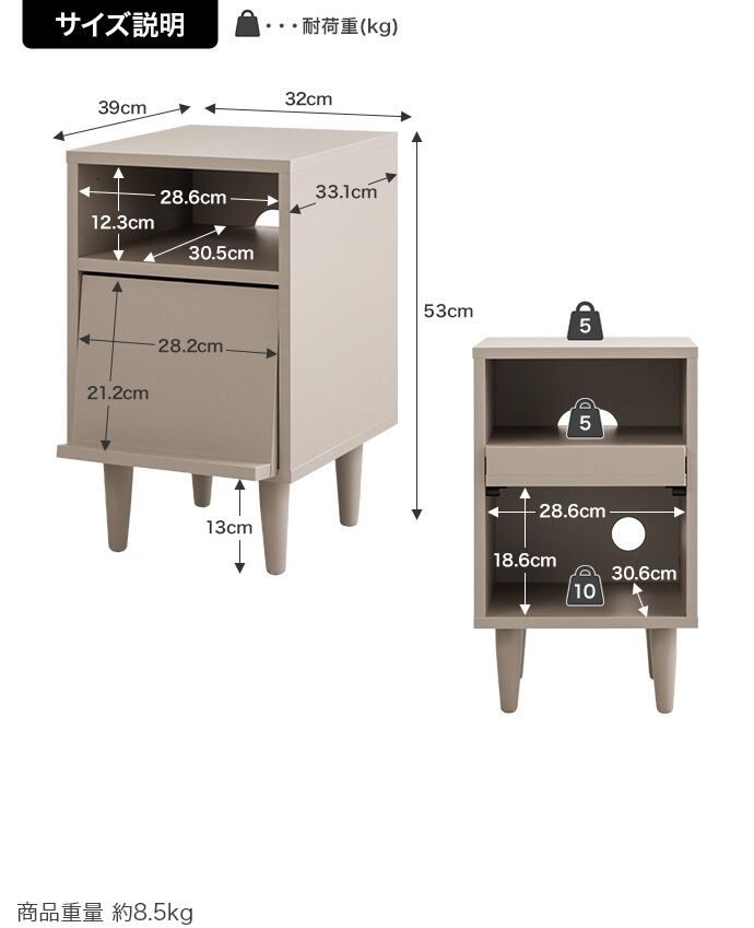 〇重量:【商品重量】約8.5kg 【耐荷重】天板:約5kg、オープン収納底板:約5kg、フラップ扉収納底板:約10kg
