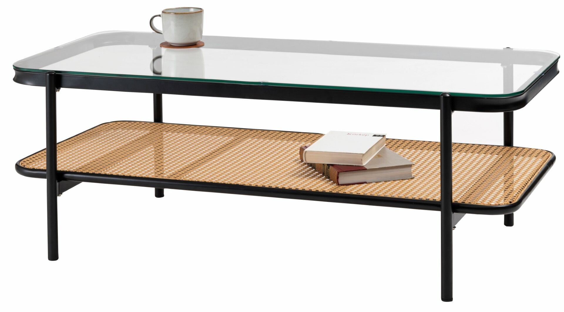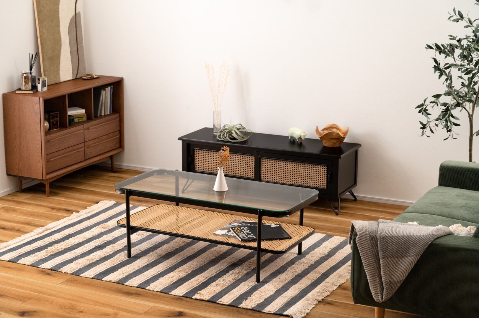 ●ブラックフレームと人工ラタンを組み合わせた、スタイリッシュさと温かみを兼ね揃えたリビングテーブル。●ガラス天板とラタン調のラックが広々とした空間を演出し、堅苦しさのないモダンな雰囲気を楽しむことができます。●ガラス天板と透け感のあるラタンは、存在感を発揮しつつもスマートな印象。●軽やかで開放的なデザインなので、置くだけで広々としたリビングルームへと変化。●天板がガラス製のため、下のラック部分を上から見ることができ、お気に入りの小物や雑貨を配置することでお洒落なディスプレイに。●天板下のラック部分は、自然な色合いのラタン調デザインを採用。●ブラックフレームとガラスのスタイリッシュな組み合わせの中に、ナチュラルなぬくもりを与えてくれます。●ガラス天板は厚さ6mmの強化ガラスを使用。通常のガラスよりも強度があり、万が一割れた場合でも鋭利にならず粉々に砕けるので、ケガをしにくく安心してご使用いただけます。●ガラス天板のズレやぐらつきを防止するために4箇所の吸盤で固定。ガラス天板の取り外しも行いやすく、日々の掃除やお手入れも簡単。