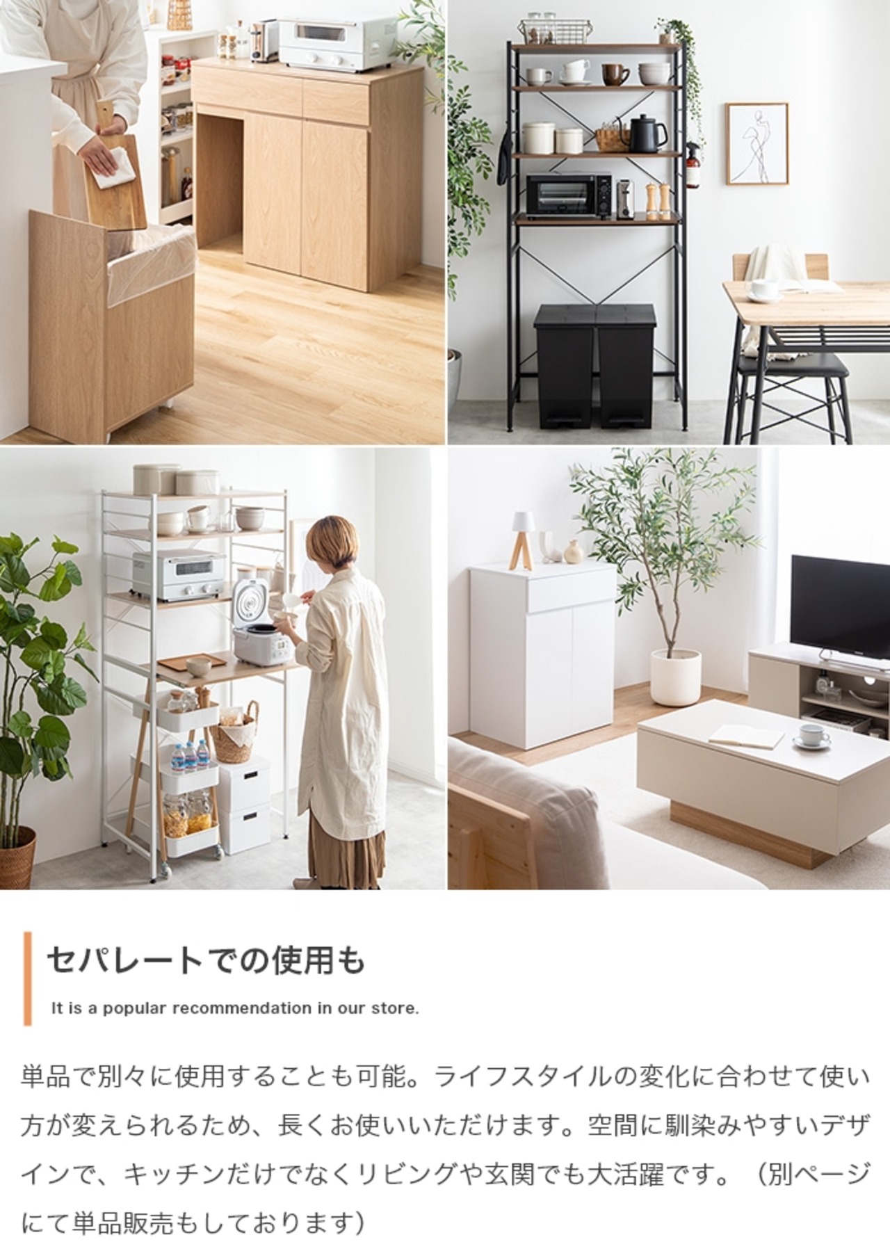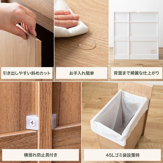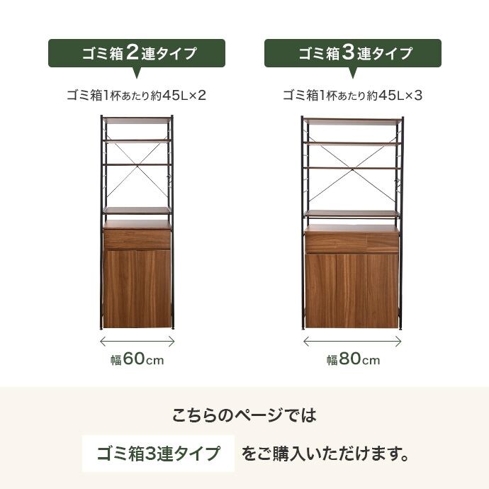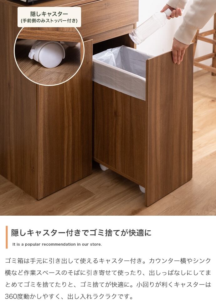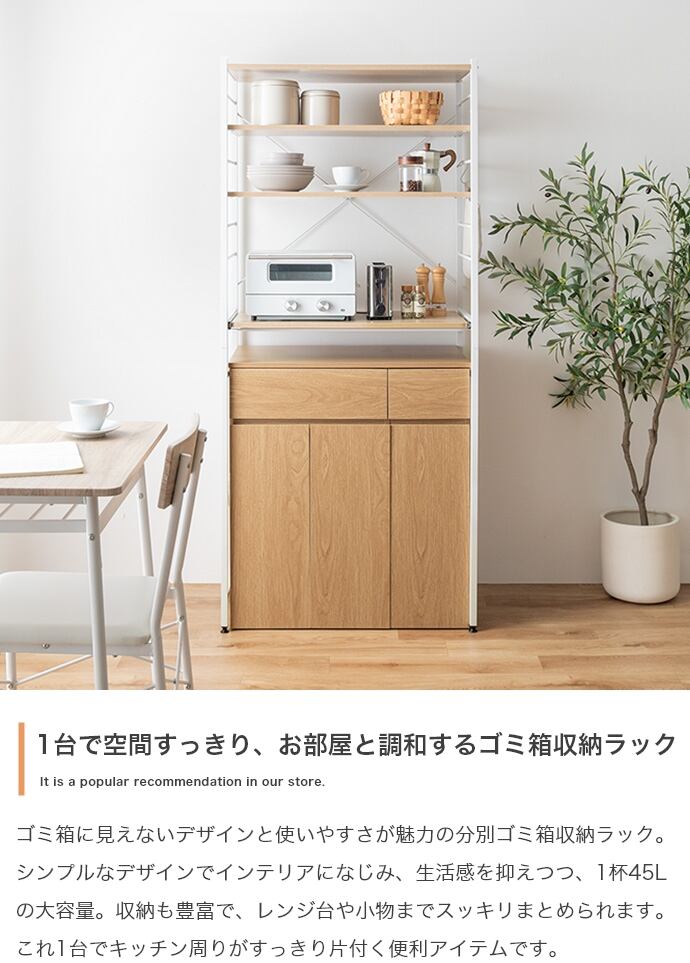 ゴミ箱に見えないデザインと使いやすさが魅力のゴミ箱付きキッチンラック。シンプルなデザインでどんなインテリアにもなじみます。分別がしやすい2連・3連タイプを用意し、面倒なゴミ捨てもスムーズ。隠しキャスター付きのゴミ箱に加え、炊飯器やポットの収納に便利なスライドトレーや、使い勝手の良い可動式収納棚も備え、機能性も抜群です。