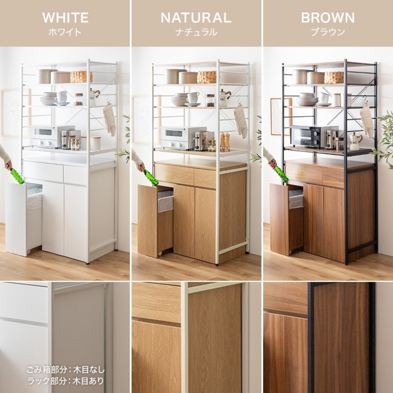〇材質:■ゴミ箱付きキッチンカウンター パーティクルボード(メラミン貼り) ■ゴミ箱上ラック