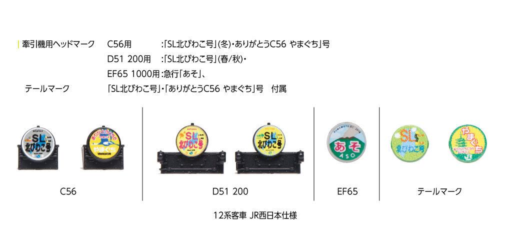 ●付属品・・・牽引機用ヘッドマーク C56用:「SL北びわこ号」(冬)・ありがとうC56 やまぐち」号・D51 200用:「SL北びわこ号」(春/秋)・EF65 1000用:急行「あそ」、テールマーク(ユーザー付パーツ)「SL北びわこ号」・「ありがとうC56 やまぐち」号、反射板(ユーザー付パーツ)、行先表示シール、交換用ナックルカプラー、ジャンパ栓、ドライバー