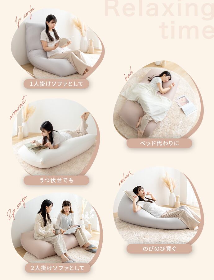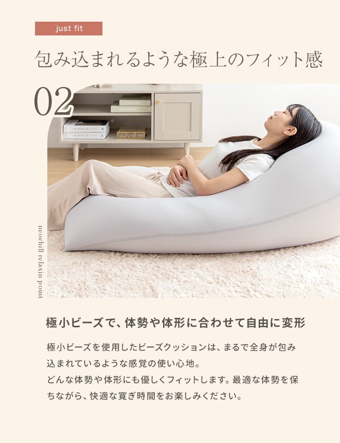 毎日のリラクゼーションタイムを、より心地よい安らぎの時間に変える『Neochill(ネオチル)』シリーズの、nobinobi ビーズクッション。自由自在に変形するので、シーンや気分に合わせてお好きな形で使うことが可能です。さらに、極小ビーズがあらゆる体勢や体形に優しくフィット。包み込まれるような極上のくつろぎ時間をお過ごしいただけます。また、付属の専用クッションカバーは当店オリジナルのくすみカラーを使用。インテリアに馴染みやすく、ご家庭での洗濯も可能なので、いつでも衛生的にお使いいただけます。