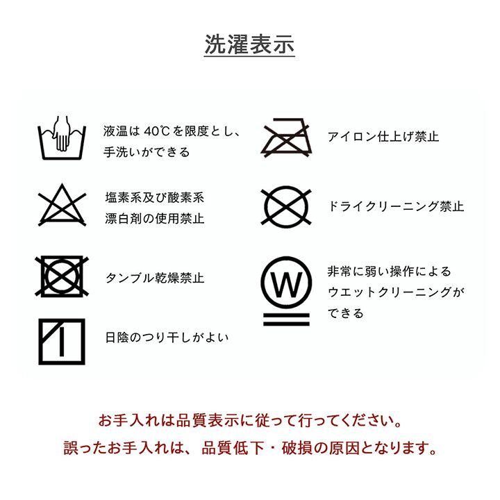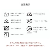 〇洗濯表示:40℃以下の水温で弱い手洗いで洗濯してください。(洗濯機は使用できません。) 干し方=日陰のつり干しがよい。