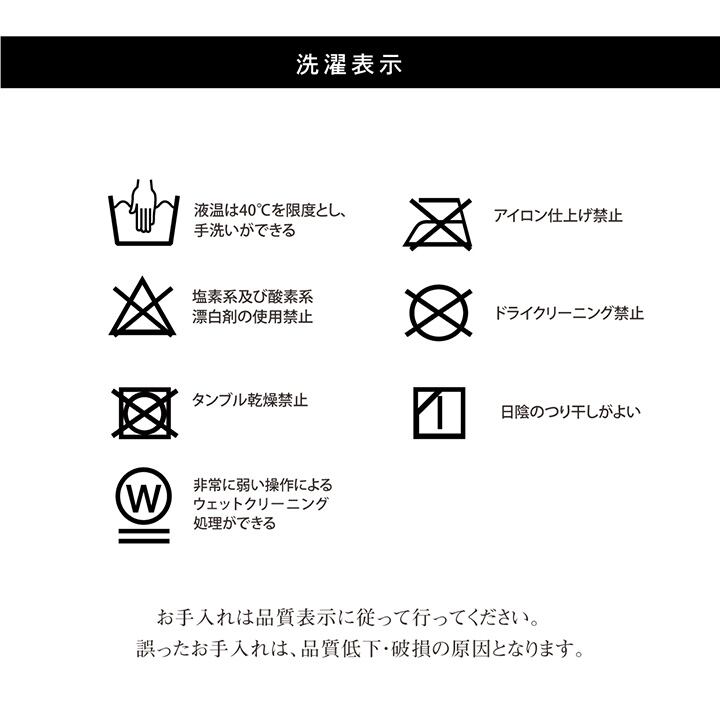 〇洗濯表示:40℃以下の水温で弱い手洗いで洗濯してください。(洗濯機は使用できません。) 干し方=日陰のつり干しがよい。