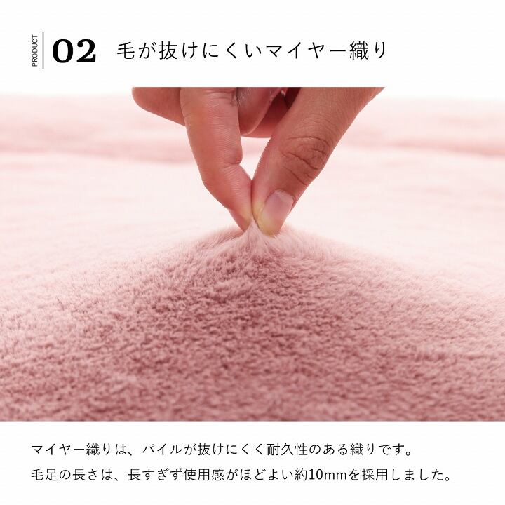 表地にはフィラメント糸でふわふわなフェイクファーを使用しています。フィラメント糸は長い繊維なので短い毛を撚って紡績している繊維よりも遊び毛がでにくいのも特長です。