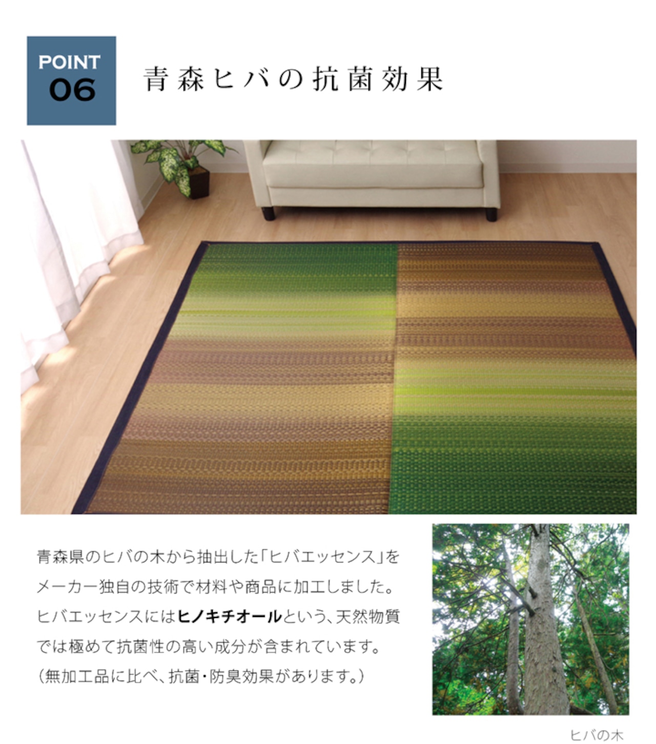 広島県のデニム生地メーカーとコラボした商品です。デニムの生地をヘリに使用しました。カラフルない草とデニムは相性ばっちりです。お部屋の雰囲気をがらりと変えてくれる商品です。国産(九州産)のい草を使用しています。一本一本が太く、表皮が厚く繊維がキメ細かいので弾力性があり、耐久性に優れています。い草には空気の自然浄化作用、湿度の調節作用などがあります。裏には国産のウレタンを使用しほどよいクッション性を持たせました。い草に青森ヒバ加工を施しています。(抗菌、防臭効果)