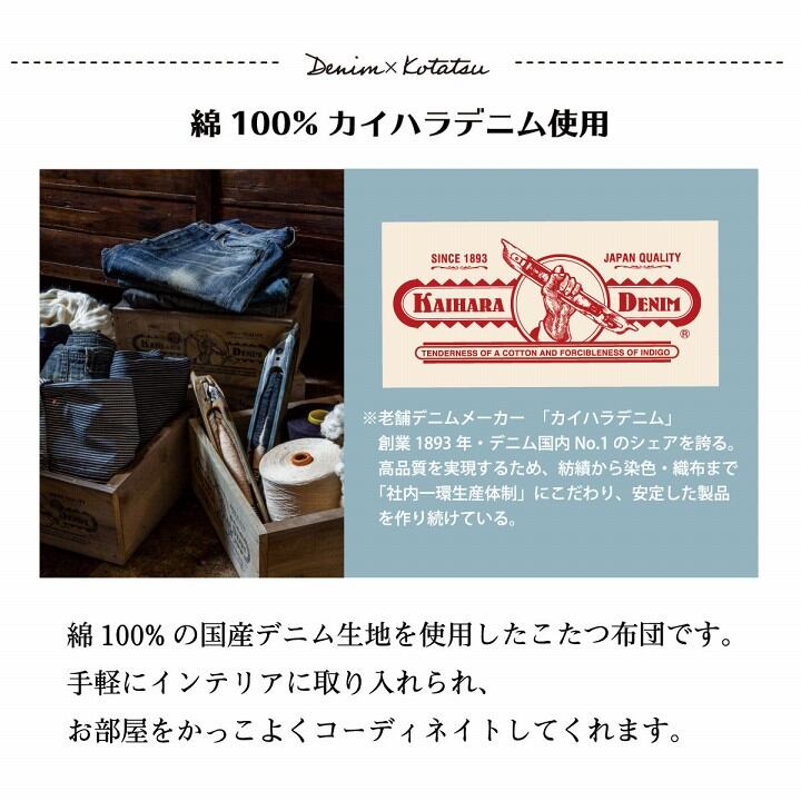 こだわりの国産デニムを使用したこたつ布団です。国産デニム生地綿100%だから安心で、しっかり丈夫な素材です。デニムの風合いを残しつつ、色落ちしにくい染め方やソフト仕上げ加工を施しています。