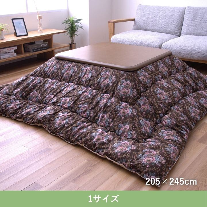 花柄のオシャレなデザインのこたつ布団。裏面は肌触りが気持ちいい素材を使用しています。保温性がある中綿を使用しているので、暖かいです。