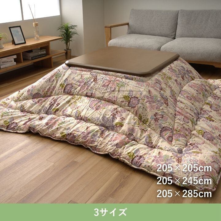 スタイリッシュな花柄デザインのこたつ布団。保温性がある中綿を使用しているので、暖かいです。