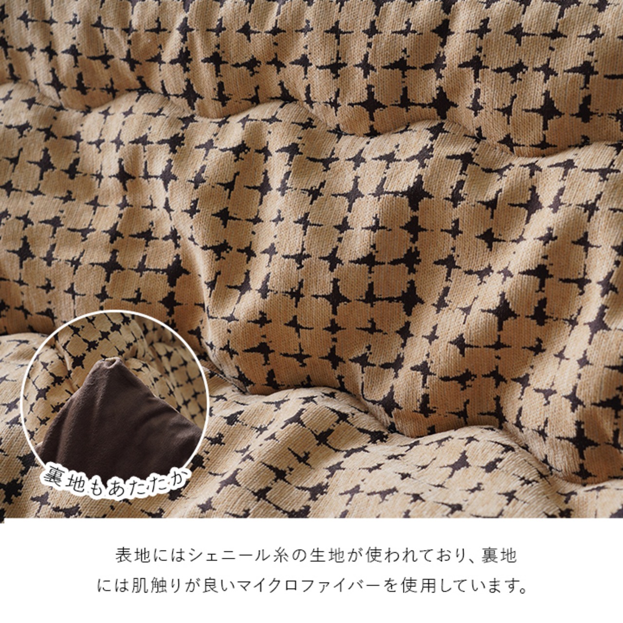 シックで上品なデザインのこたつ布団です。表地にはシェニール糸を使用した生地を使用しています。裏地には肌触りが良いマイクロファイバーを使用しています。中綿には弾力性と保温性の高い東レマッシュロン綿を使用しているため軽くて暖かいです。部分暖房のこたつは電気代もおトクです。