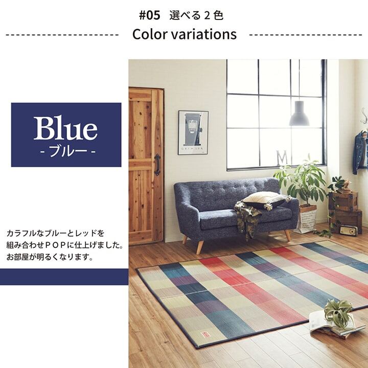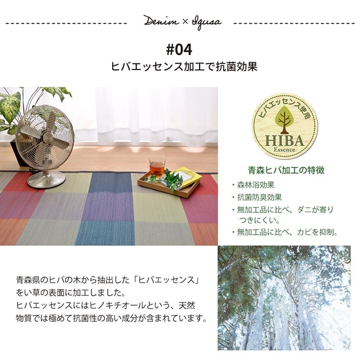 広島県のデニム生地メーカーとコラボした商品です。デニムの生地をヘリに使用しました。カラフルない草とデニムは相性ばっちりです。お部屋の雰囲気をがらりと変えてくれる商品です。国産(九州産)のい草を使用しています。一本一本が太く、表皮が厚く繊維がキメ細かいので弾力性があり、耐久性に優れています。い草には空気の自然浄化作用、湿度の調節作用などがあります。裏には国産のウレタンを使用しほどよいクッション性を持たせました。い草に青森ヒバ加工を施しています。(抗菌、防臭効果)