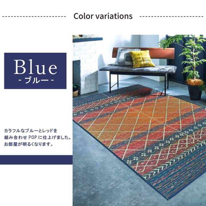 広島県のデニム生地メーカーとコラボしたい草ラグです。デニムの生地をヘリに使用しました。カラフルない草とデニムは相性ばっちりです。