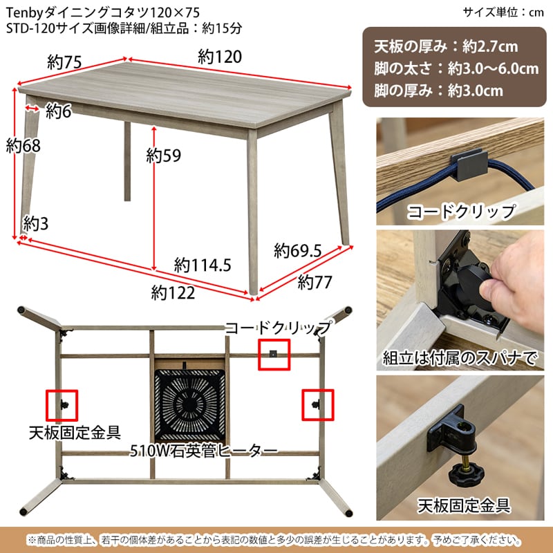 サイズ:幅1220×奥行770×高さ680mm天板厚:約27mm本体重量15.0kg組立式(約15分/付属の工具にて組立)1個口