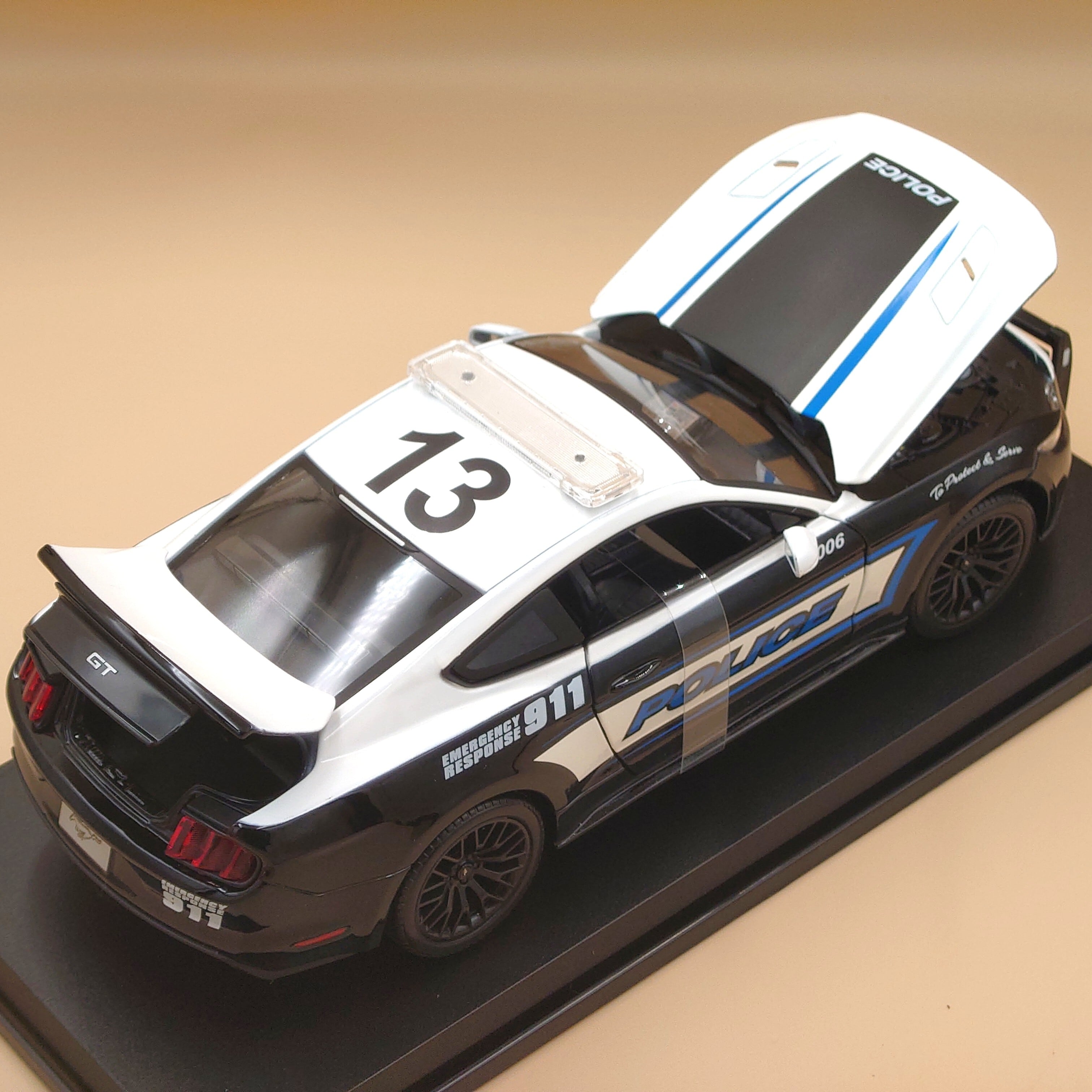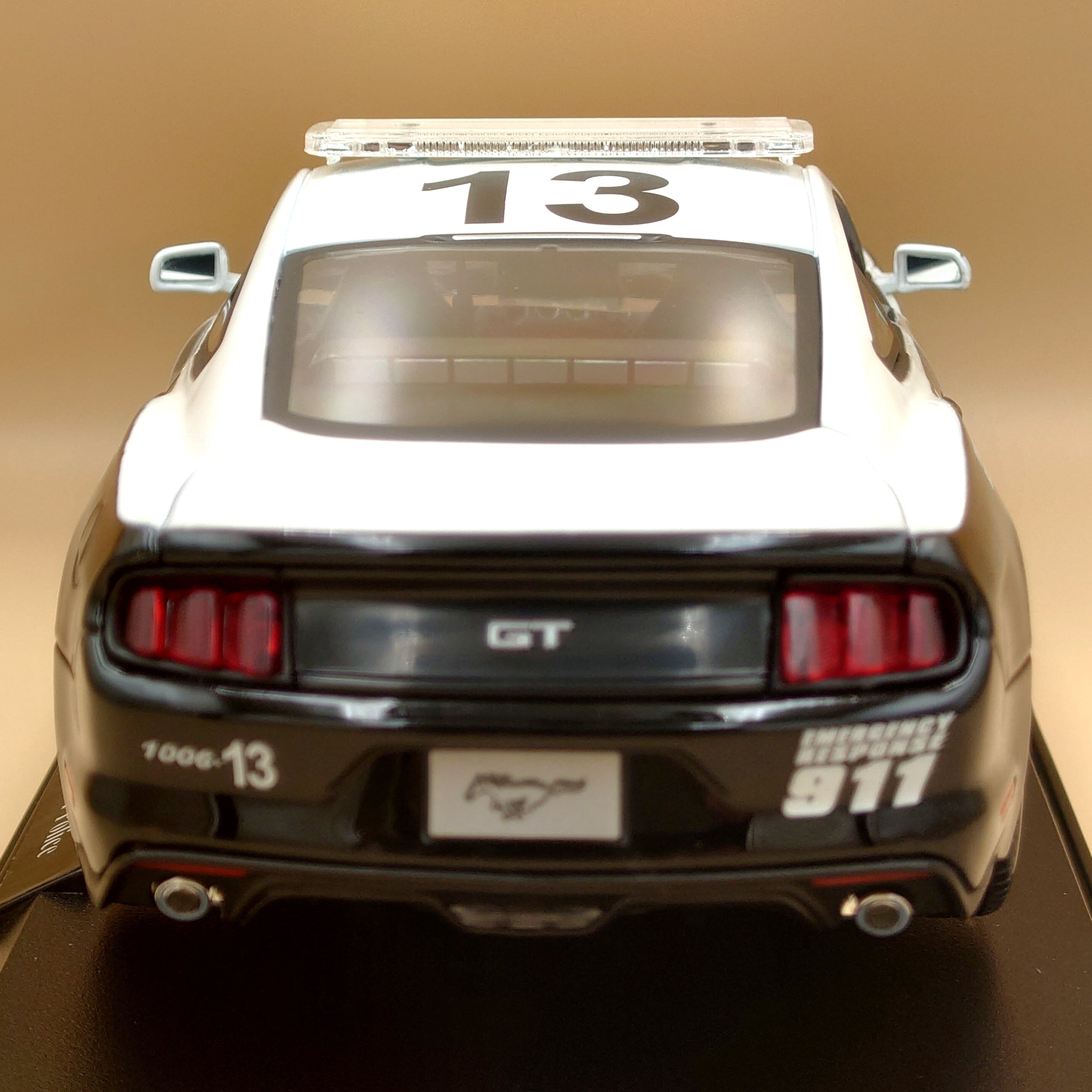 マスタングGTのアメリカンポリスのかっこいいシルエットとボディのツートンカラーリングが渋いです。車内・外ともに細部まで本物そっくりに再現されていて、いい雰囲気が出ています。コレクションやインテリアとしても最適です。