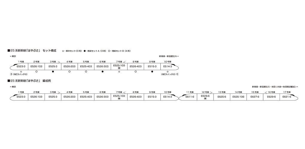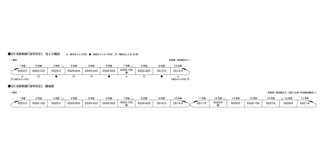 ・セットに含まれる車両は<10-1969 E5系新幹線「はやぶさ」 基本セット(3両)>と同様