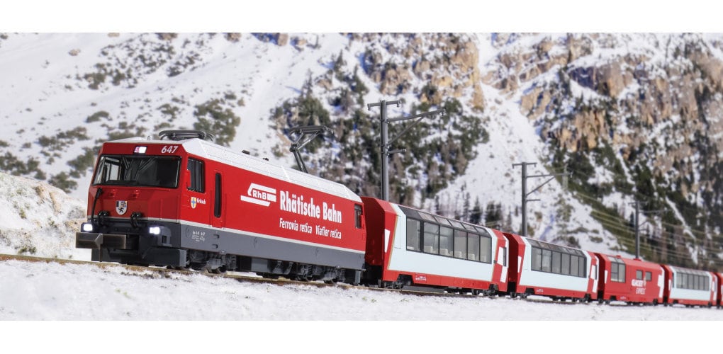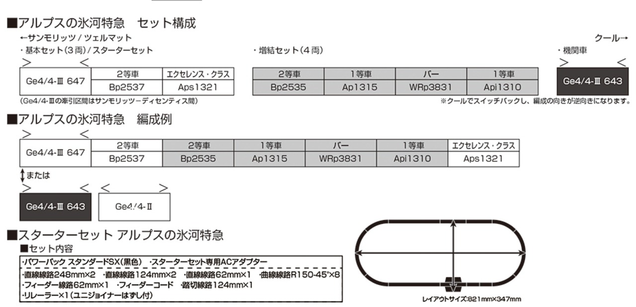 実車はスイス南西部のヨーロッパアルプスを貫き、ツェルマットからサンモリッツまでをレーティッシュ鉄道とマッターホルン・ゴッタルド鉄道の2つの鉄道会社にまたがって、ゆっくりと8時間かけて走破し、雄大なアルプスの車窓を楽しむパノラマ観光列車として人気を呼んでいます。2019年には1等車のさらに上位である「エクセレンス・クラス」が登場し、従来の客車にも変化が出てきています。