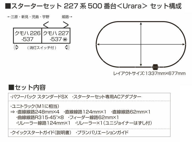 ①岡山地区で広く活躍する227系500番台とユニトラック線路、パワーパックがひとまとめになったスターターセットで、これから鉄道模型を始める方におすすめです。