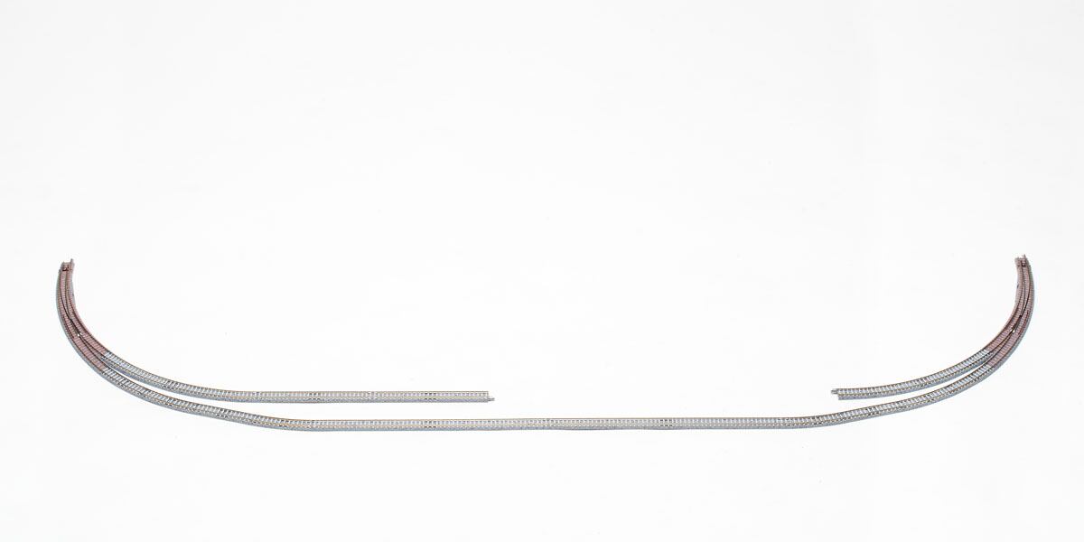 従来の<91095>レールセットカーブポイントセットⅡ(レールパターンE)のまくら木をポイントを合成樹脂製まくら木、その他をPCまくら木としたセットです。●レール配置は島式ホームにあわせ、カーブポイントにより単線が駅用の間隔55.5mmの複線に分岐して広がり、再びカーブポイントにより単線に戻る形