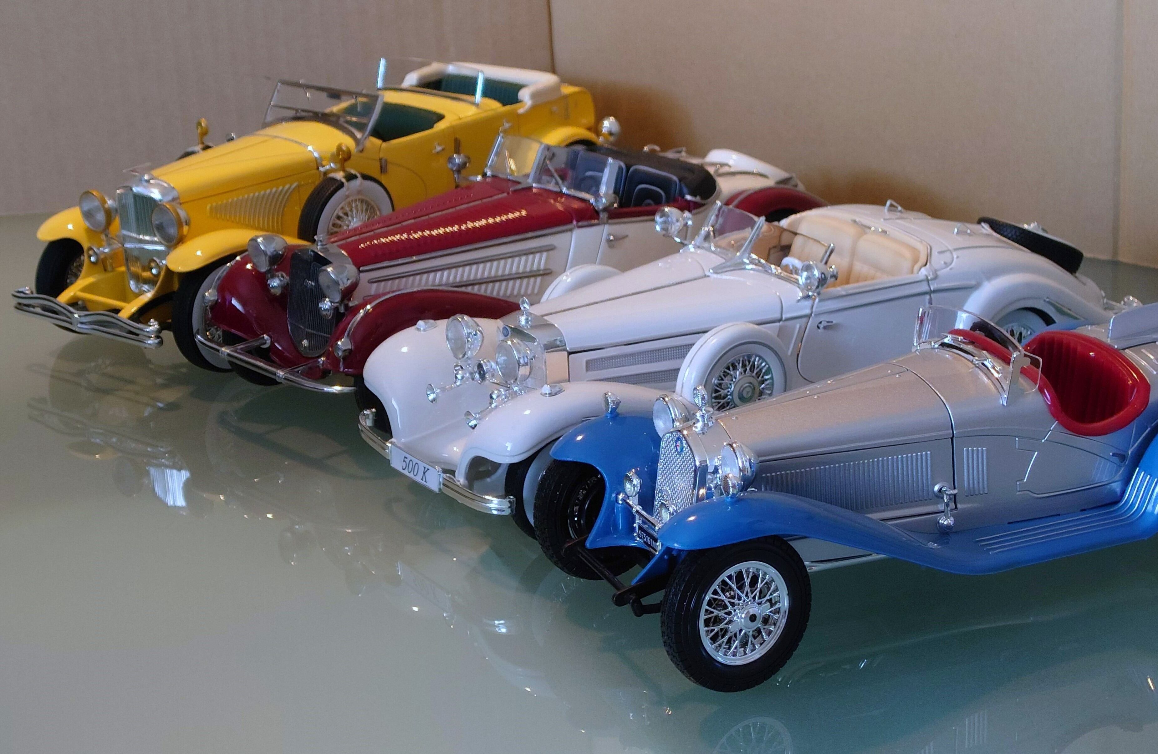 この懐かしいスポーツタイプのかっこいいシルエットとボディのカラーリングがとてもきれいです。車内・外ともに細部まで本物そっくりに再現されています。いい雰囲気が出ています。完成度の高い一台です。最後の参考写真のようにクラシックカーを並べてみました。コレクションやインテリアとしても最適です。