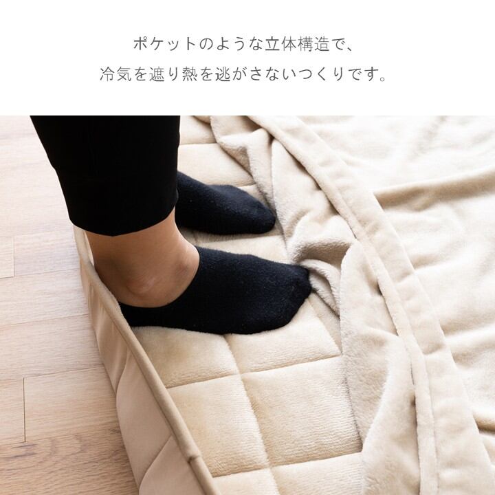 足を入れるだけで、暖かさを閉じ込める足湯マットです。高さがあるから足元が冷えやすいので、暖かさを逃がさない居場所を生み出しました。ポケットのような立体構造で、冷気を遮り熱を逃がさないつくりです。