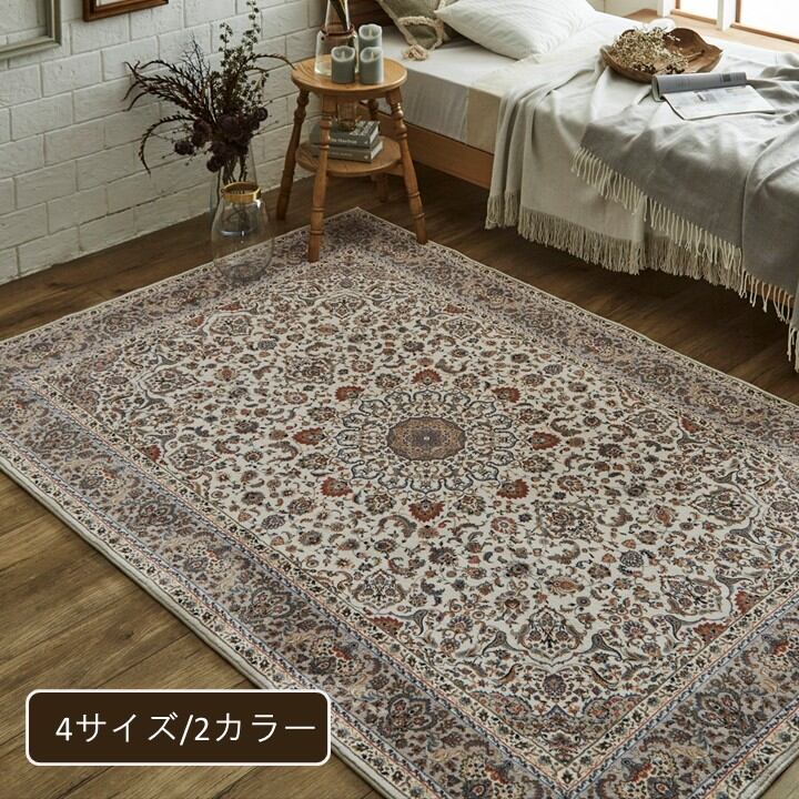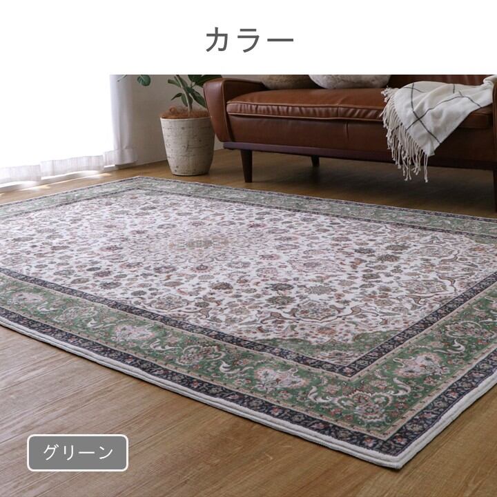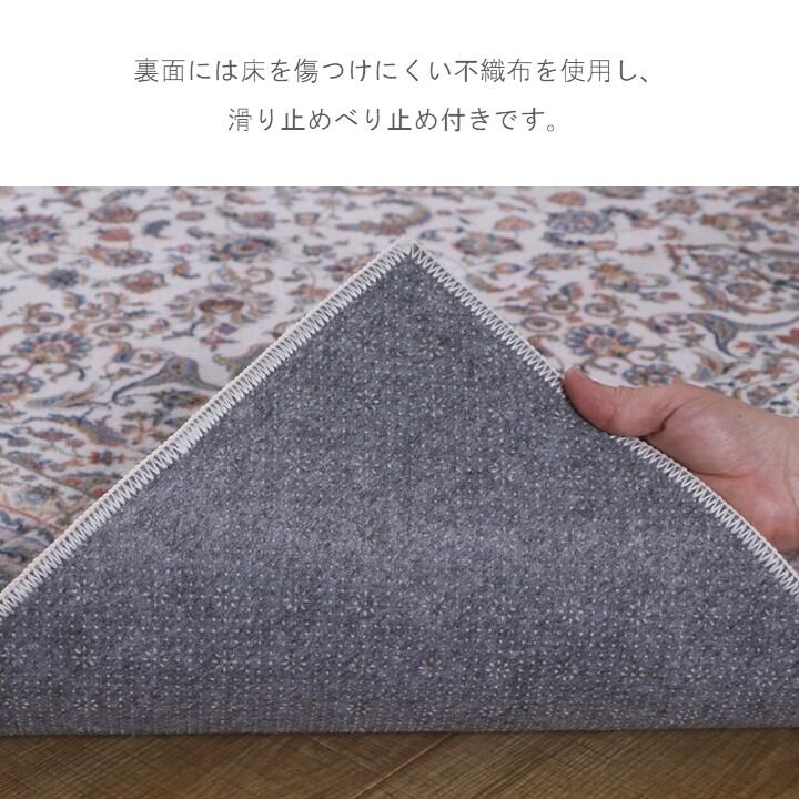 表地が高目付で繊細なデザインをプリントした、高級感のあるカーペットです。やわらかなタッチ感で、年間使える商品です。床暖房・ホットカーペットにも対応しています。裏面には床を傷つけにくい不織布を使用し、滑り止めべり止め付きです。