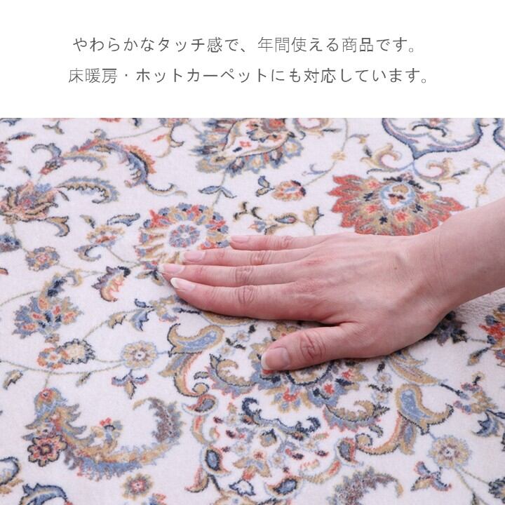 表地が高目付で繊細なデザインをプリントした、高級感のあるカーペットです。やわらかなタッチ感で、年間使える商品です。床暖房・ホットカーペットにも対応しています。裏面には床を傷つけにくい不織布を使用し、滑り止めべり止め付きです。