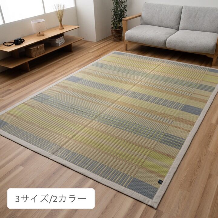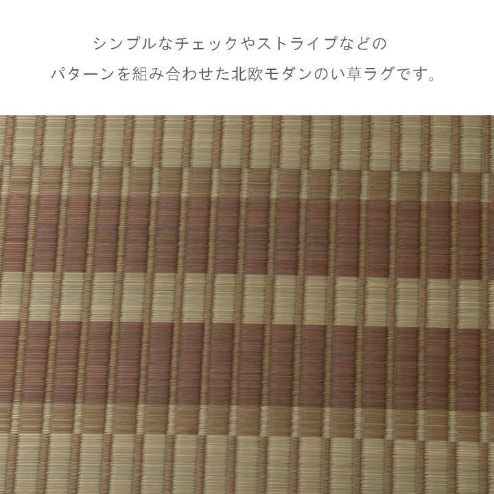 シンプルなチェックやストライプなどのパターンを組み合わせた北欧モダンのい草ラグです。縁に滋賀県の近江で織った麻は豊かな水と湿度で丁寧に織り染められた美しい光沢感があるものを使用しました。