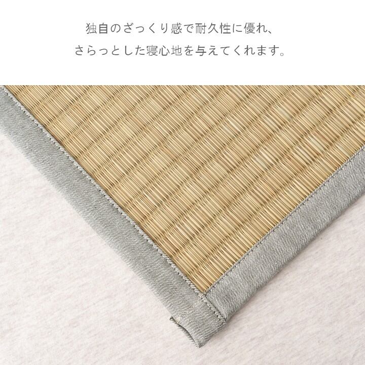 沖縄で作られている独自の風合いをもつ、い草を使用した敷パッドです。独自のざっくり感で耐久性に優れ、さらっとした寝心地を与えてくれます。