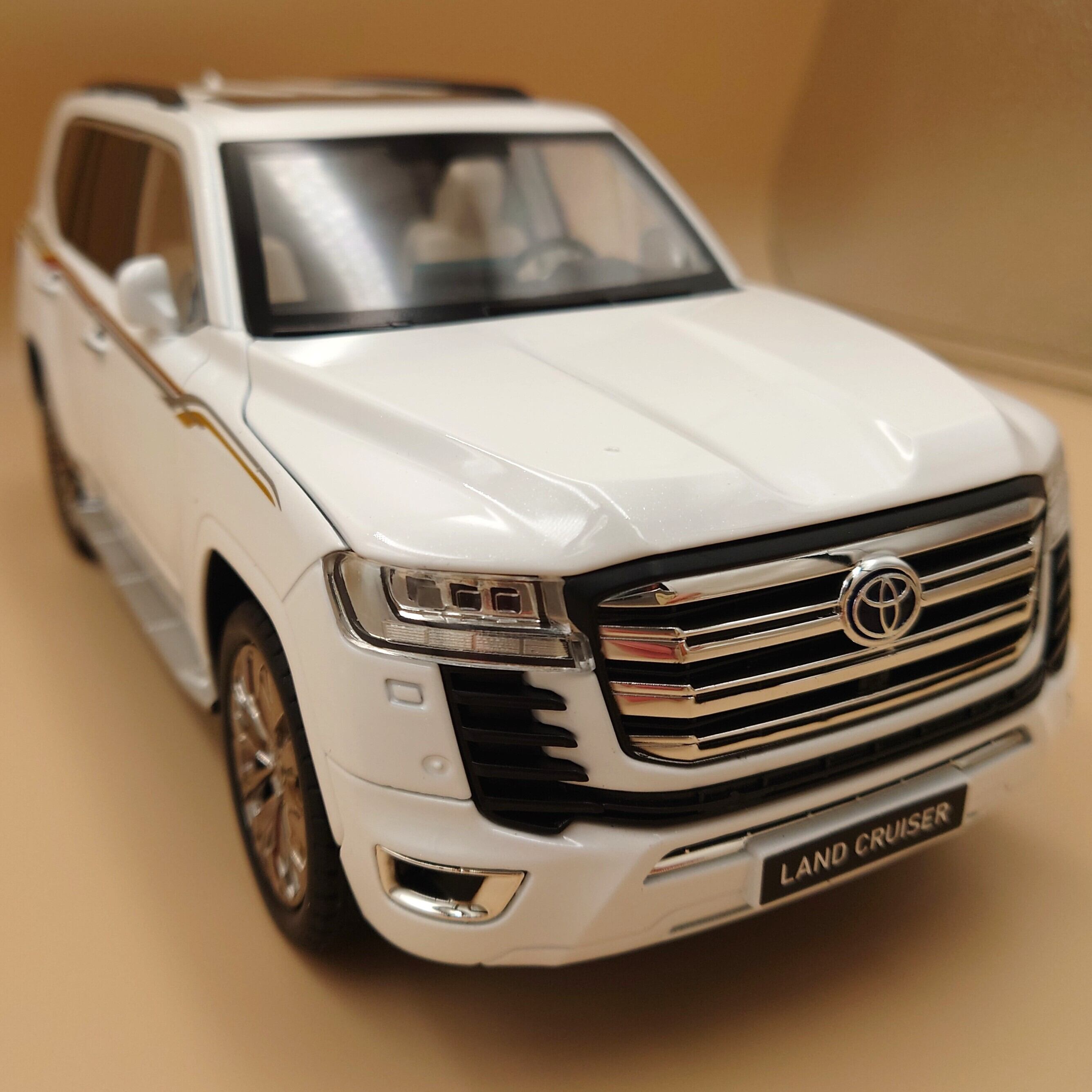 この最新タイプのランクルのかっこいいシルエットとボディのパールカラーリングがとてもきれいです。いい雰囲気が出ていて、完成度の高い一台です。コレクションやインテリアとしても最適です。