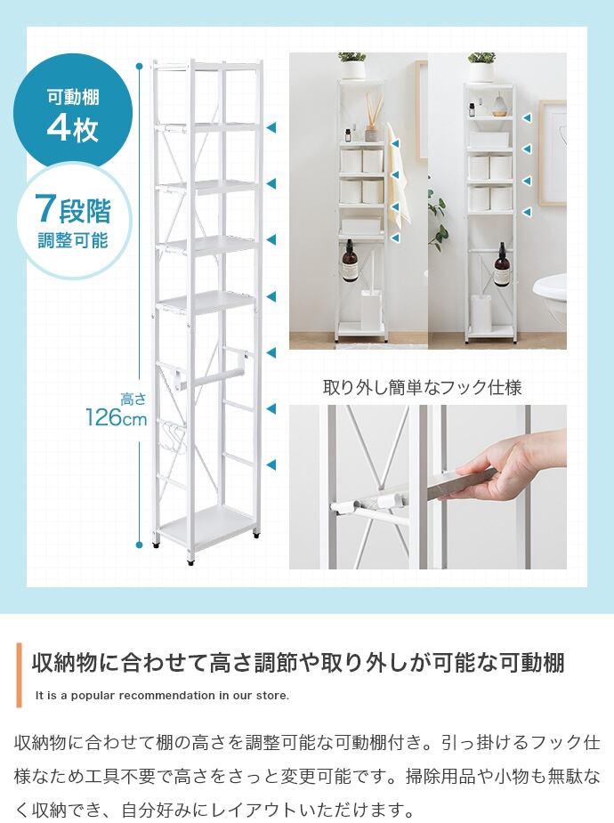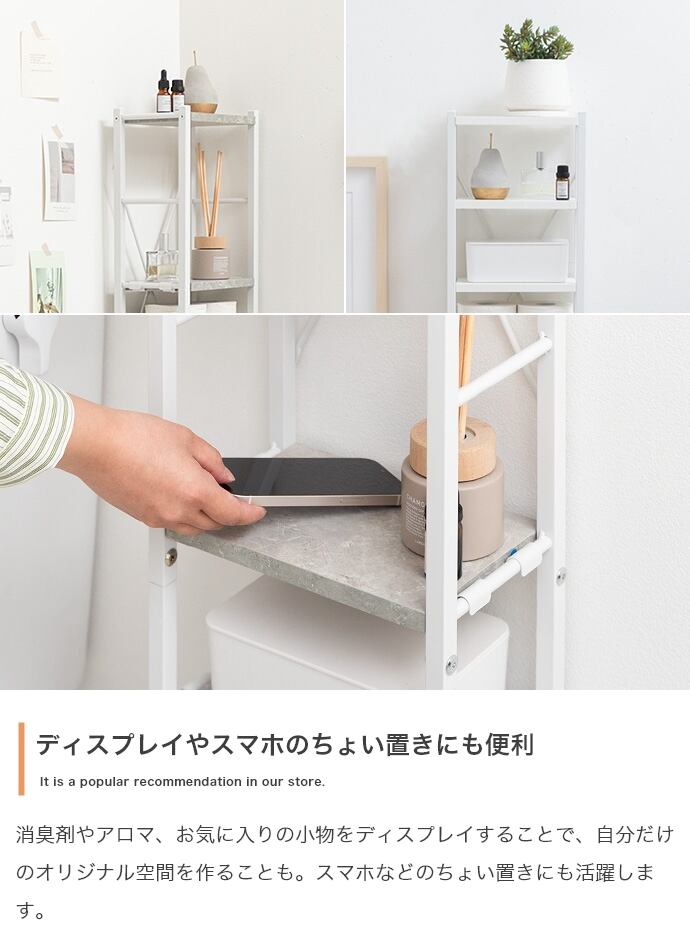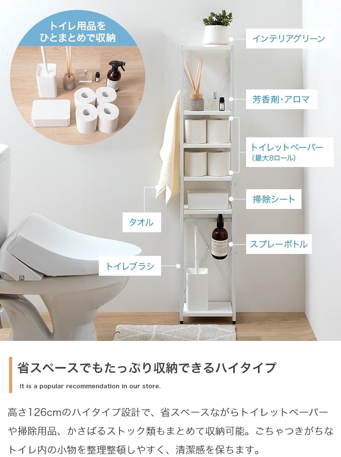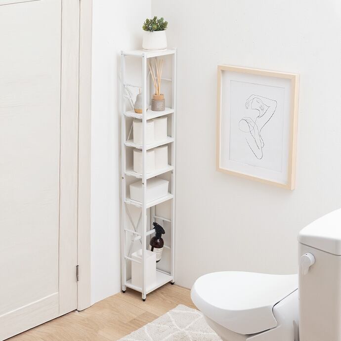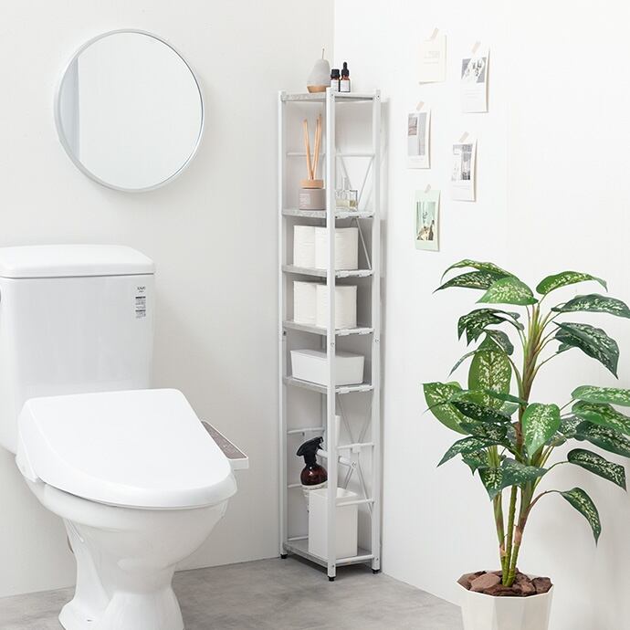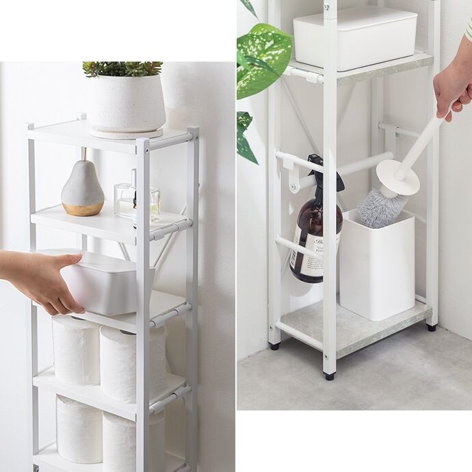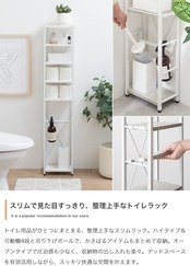 トイレ用品がひとつにまとまるスリムトイレラック。ハイタイプ&可動棚4段と吊り下げポールで、かさばるアイテムもまとめて収納。オープンタイプで圧迫感も少なく、収納物の出し入れも楽々。デッドスペースを有効活用しながら、スッキリ快適な空間を叶えます。