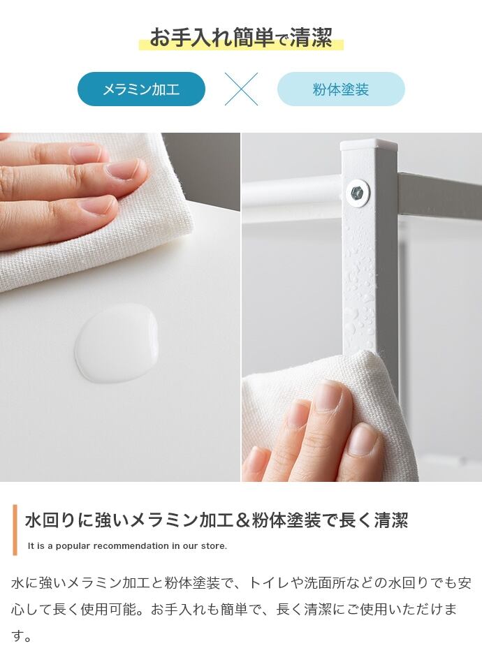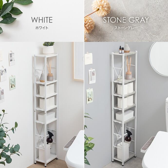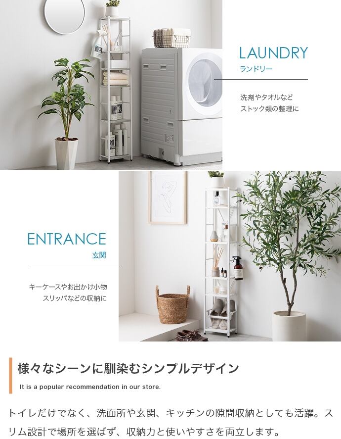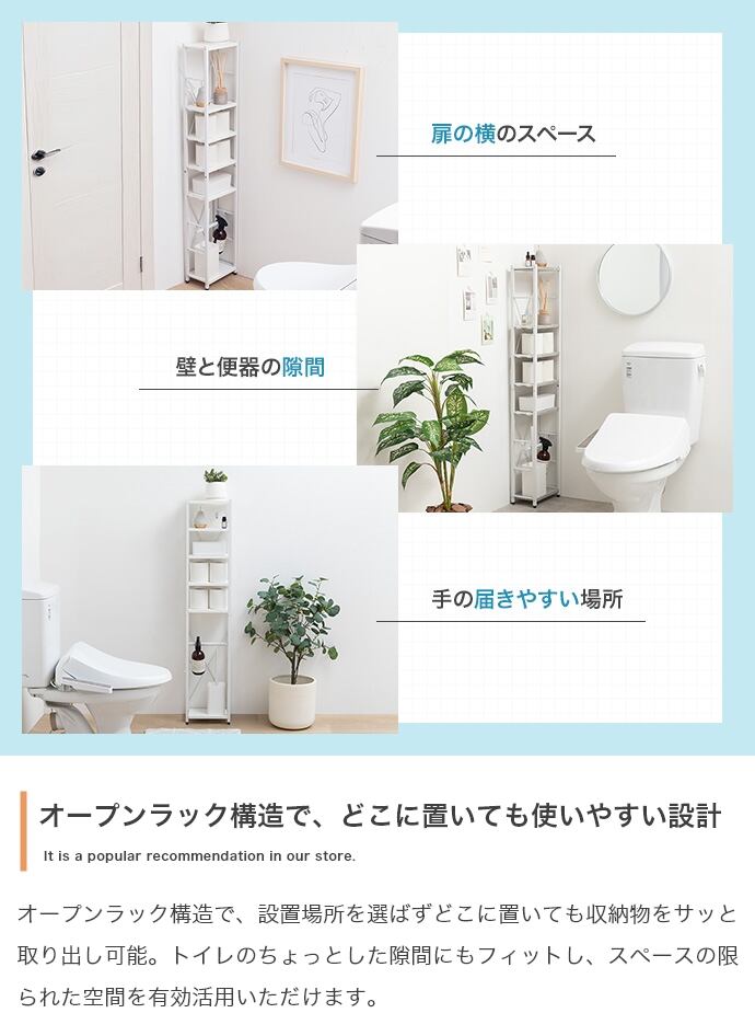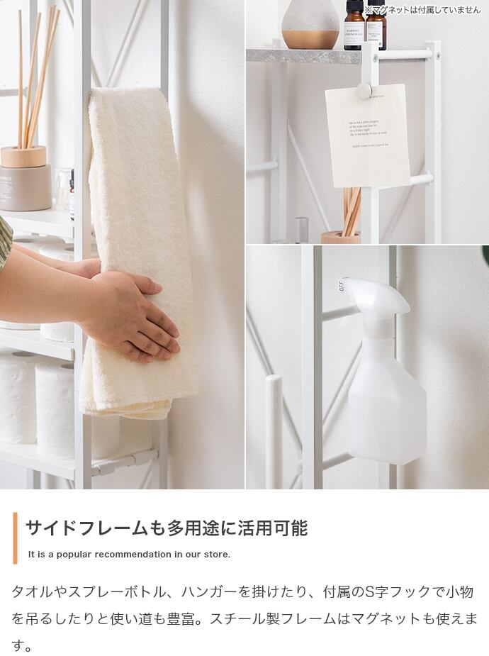 トイレ用品がひとつにまとまるスリムトイレラック。ハイタイプ&可動棚4段と吊り下げポールで、かさばるアイテムもまとめて収納。オープンタイプで圧迫感も少なく、収納物の出し入れも楽々。デッドスペースを有効活用しながら、スッキリ快適な空間を叶えます。