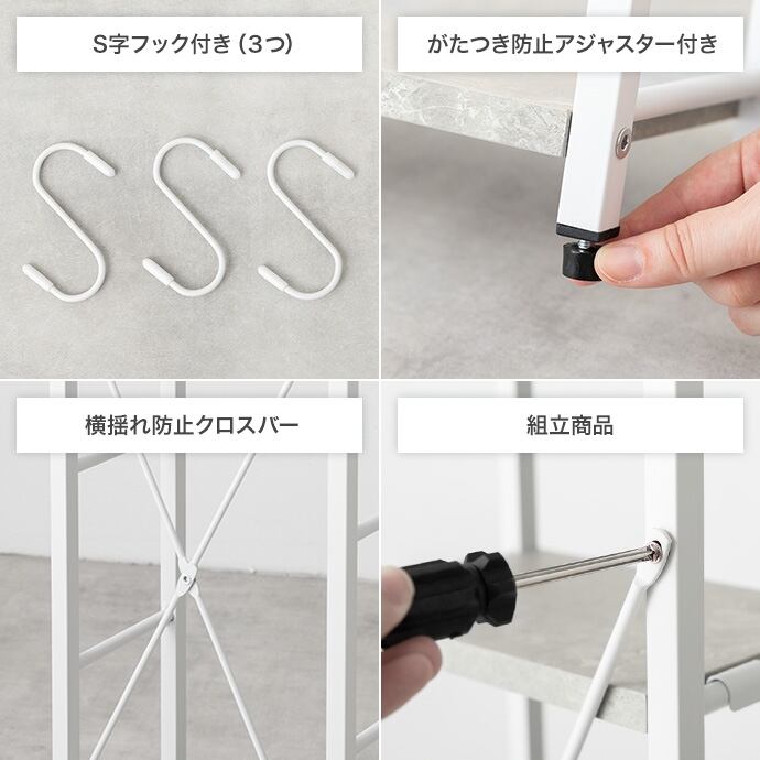〇重量:【商品重量】約4.6kg 【耐荷重】天板:約5kg 、可動棚:各約2kg、サイドフレーム:約0.3kg、吊り下げポール:約2kg