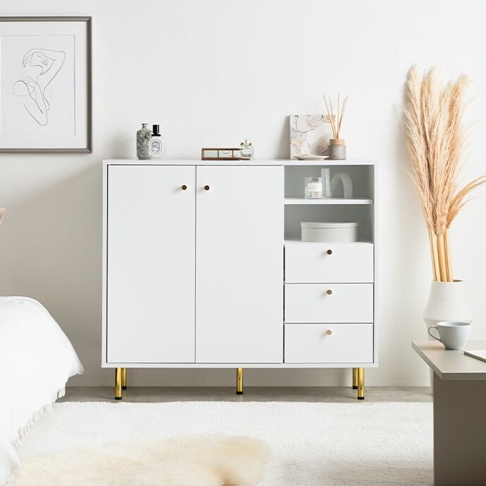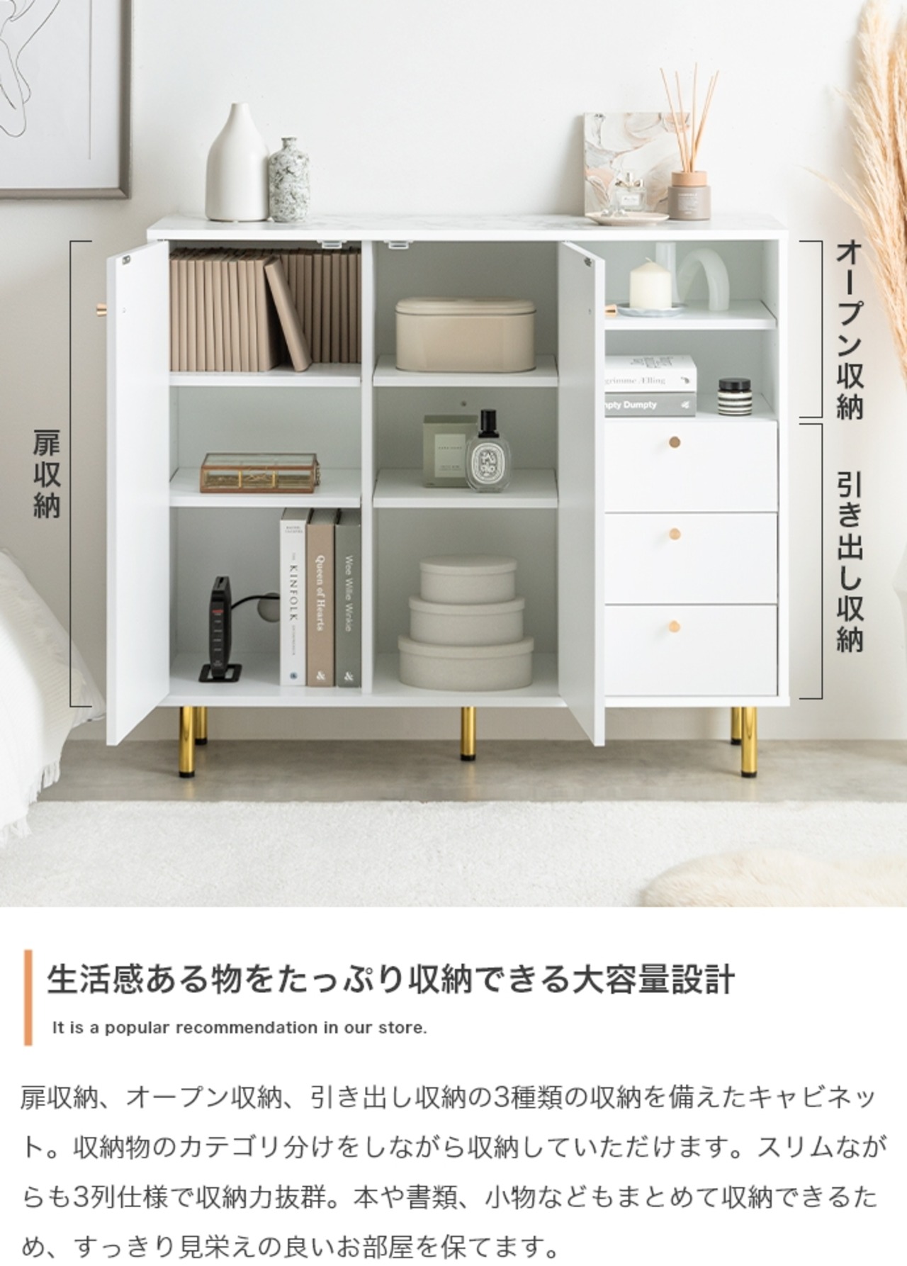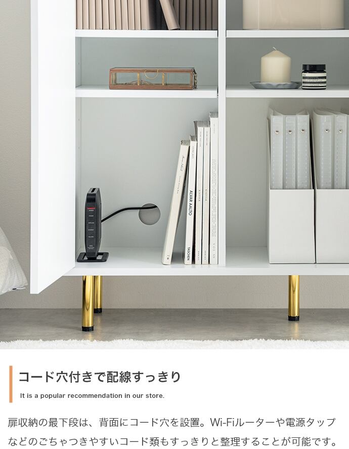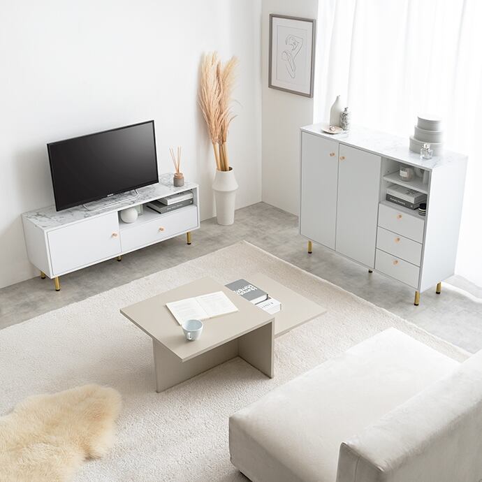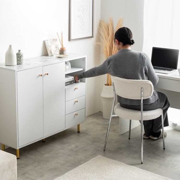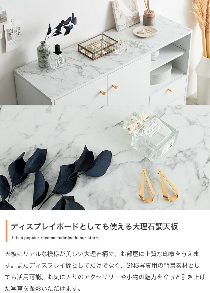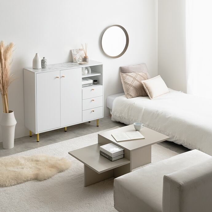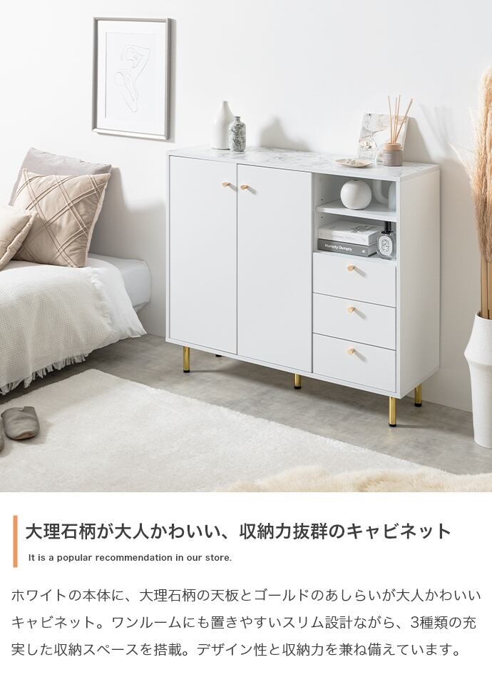 天板の大理石柄とゴールドのあしらいが特徴のキャビネット。大人かわいいデザインの本体とスタイリッシュなゴールド脚付きで、置くだけでお部屋の雰囲気を高めてくれます。3つの収納スペースと背面のケーブル穴で、ごちゃつきがちな雑貨や雑誌、LANケーブル類などもスマートに整理でき、生活感がなく美しい空間を実現可能です。また奥行は約34.4cmとスリム設計のため、一人暮らしやワンルームなど限られたスペースにもすっきり置いていただけます。