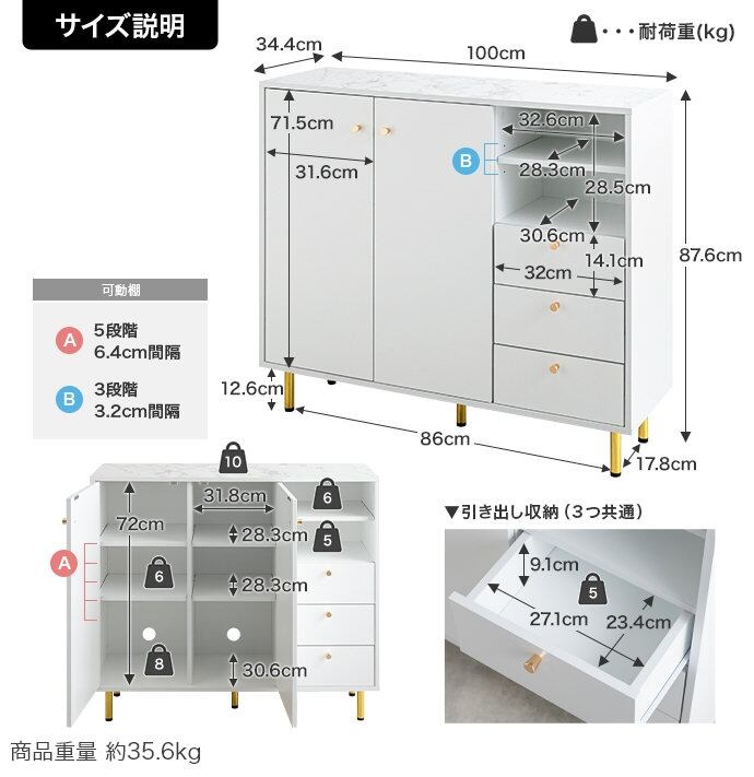 〇重量:【商品重量】約35.6kg 【耐荷重】天板:約10kg、可動棚:(各)約6kg、オープン収納底板:約5kg、扉収納底板:約8kg、引き出し底板:(各)約5kg