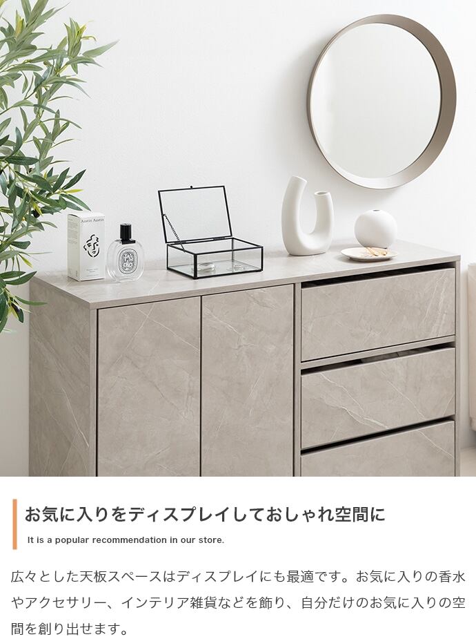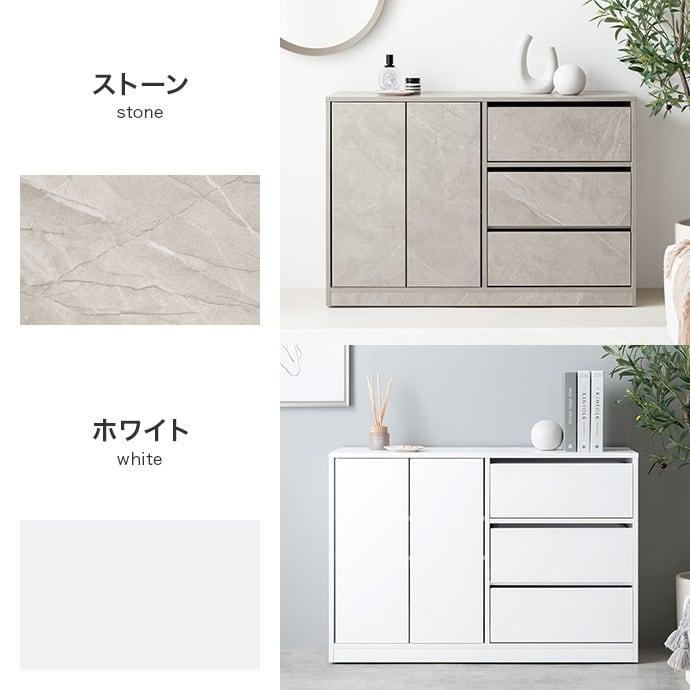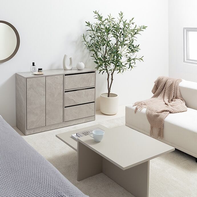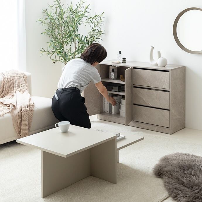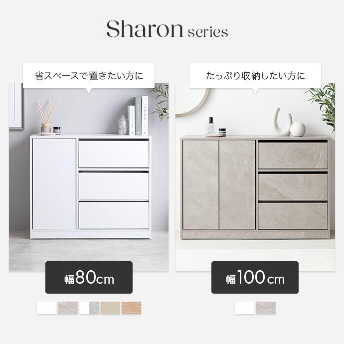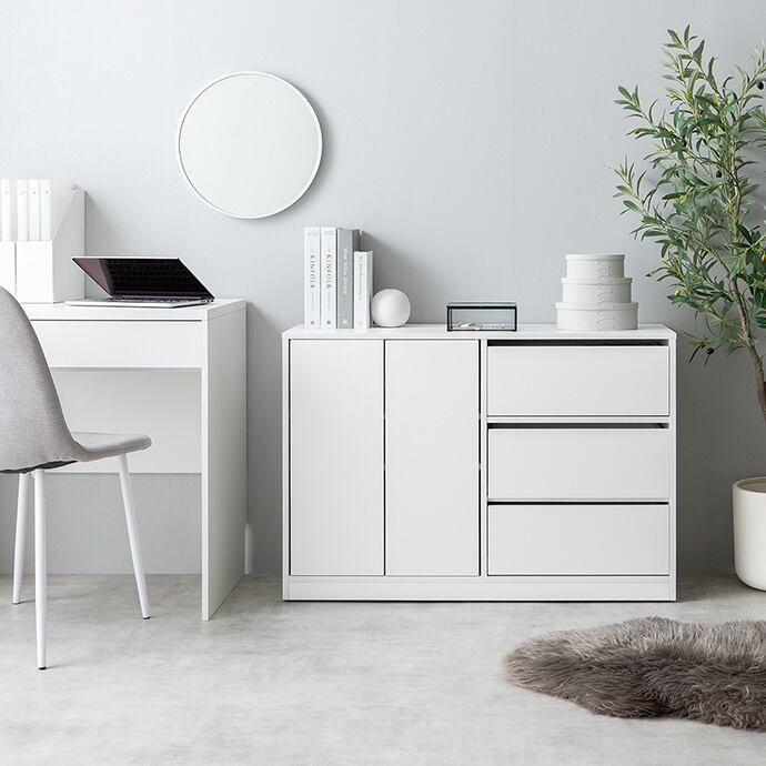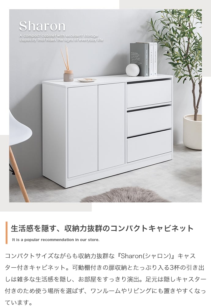 コンパクトサイズながらも収納力抜群な『Sharon(シャロン)』キャスター付きキャビネット。2枚の可動棚付きの扉収納とたっぷり入る3杯の引き出しは、雑多な生活感を隠し、お部屋をすっきりと演出。足元には正面から見えない隠しキャスター付きなので使う場所を選ばず、ワンルームやリビングにも置きやすくなっています。