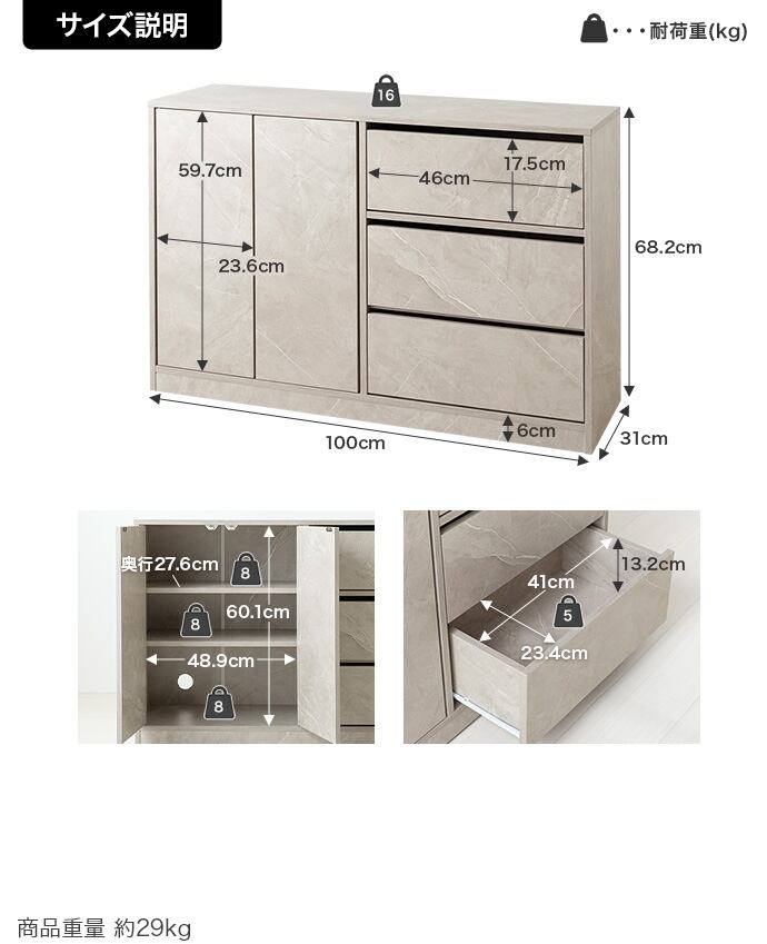 〇重量:【商品重量】約29kg 【耐荷重】天板:約16kg 、引き出し:約5kg、可動棚:約8kg 、扉収納内底板:約8kg