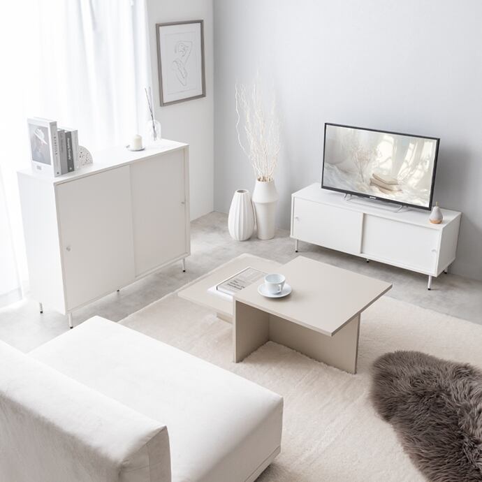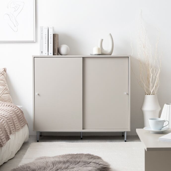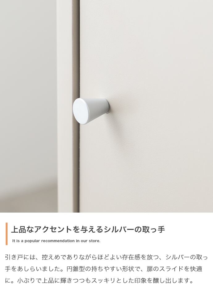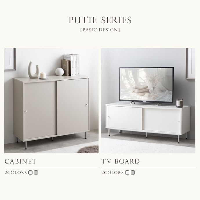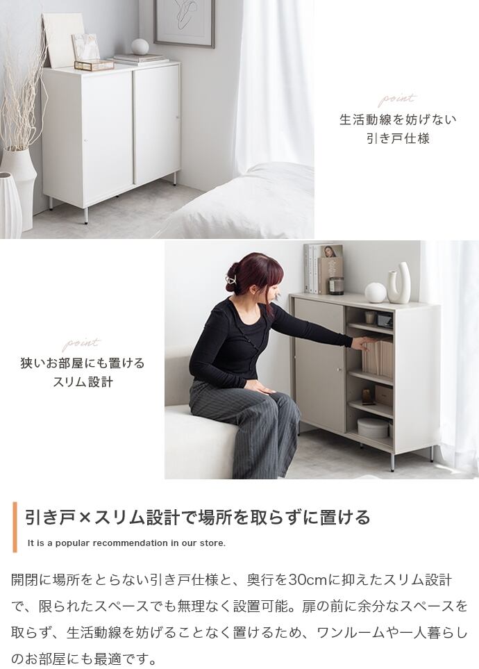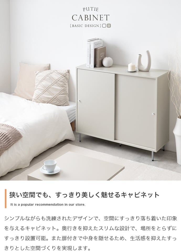 シンプルながらも洗練されたデザインで、空間にすっきり落ち着いた印象を与える『Putie(プティ)』キャビネット。開閉に場所をとらない引き戸仕様と奥行きを抑えたスリムな設計で、限られたスペースでも無理なく設置可能。扉の前に余分なスペースを取らず、生活動線を妨げることなく置けるため、ワンルームや一人暮らしのお部屋にも最適です。また扉付きで中身を隠せるため、生活感を抑えたすっきりとした空間づくりを実現します。