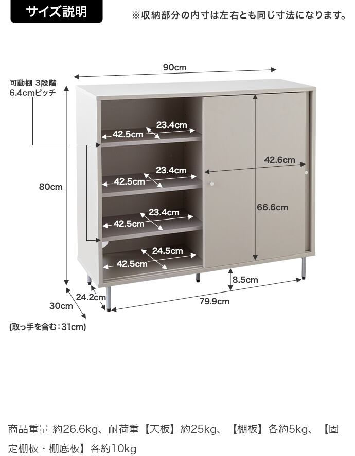 〇重量:【商品重量】約26.6kg 【耐荷重】天板:約25kg 、棚板:各約5kg、固定棚板・棚底板:各約10kg