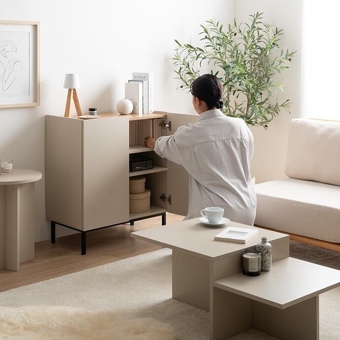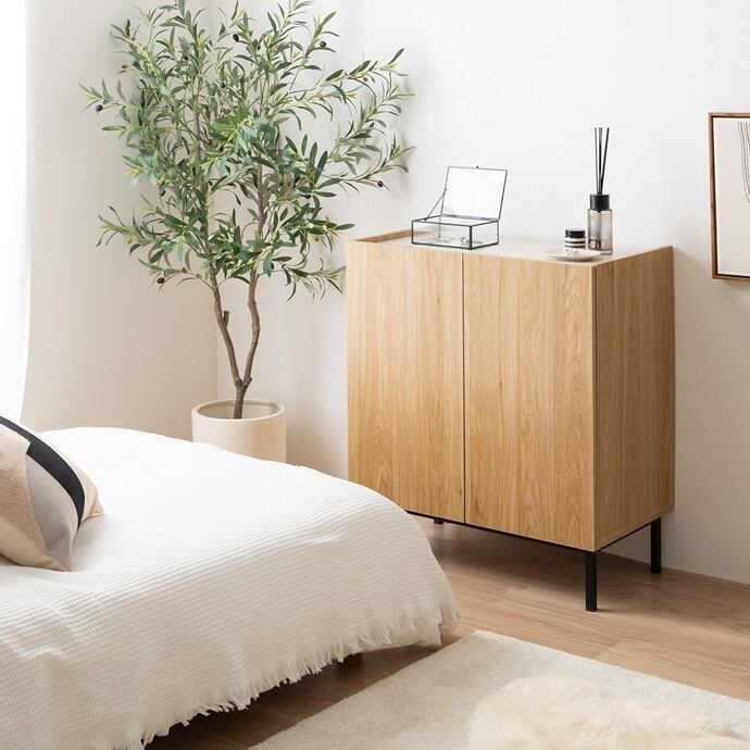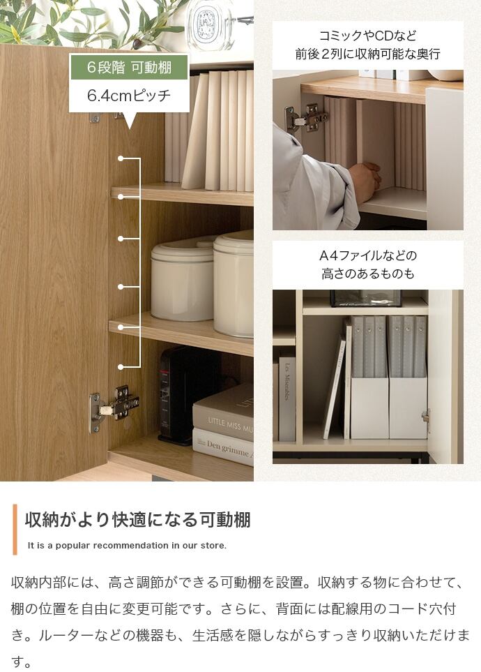 木目×無地のバイカラーが美しい、空間を彩る『Alq(アルク)』シリーズのキャビネット。直線的なフラットデザインと印象的な配色で、置くだけで洗練された空間を演出。大容量収納と背面のコード穴で、ごちゃつきやすい小物類からA4サイズの書類、ルーターのコード類まで、すっきりまとめて収納可能です。
